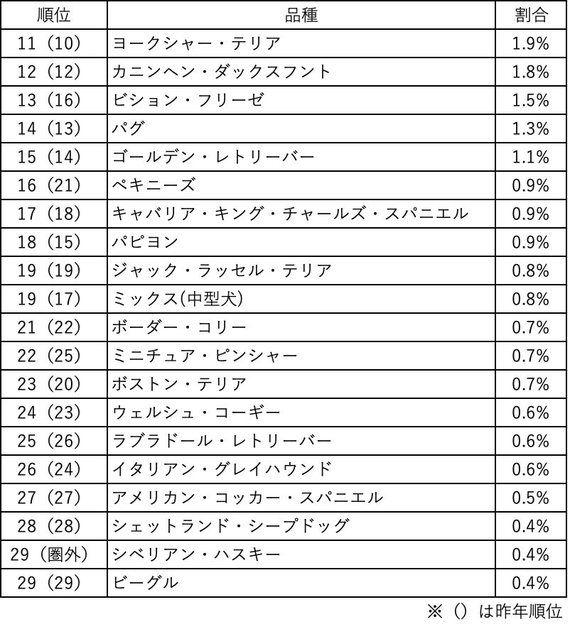 11〜30位までのランキングでは、「ビション・フリーゼ」が昨年16位から13位に、「ペキニーズ」が21位から16位にランクアップしています。大型犬では友好的で忠実な性格が魅力の「ゴールデン・レトリーバー」が昨年より1つ順位を落としたものの引き続き人気が高く、「ボーダー・コリー」は22位から21位に、「ラブラドール・レトリーバー」も26位から25位にランクアップしており大型犬の人気も出てきているようです。