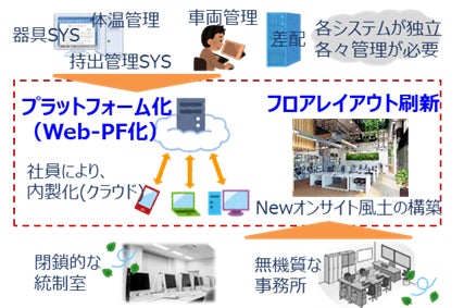 (体温測定・アルコールチェック・工具持ち出し管理・1日の行動線表などのDX化の取組み展示)
