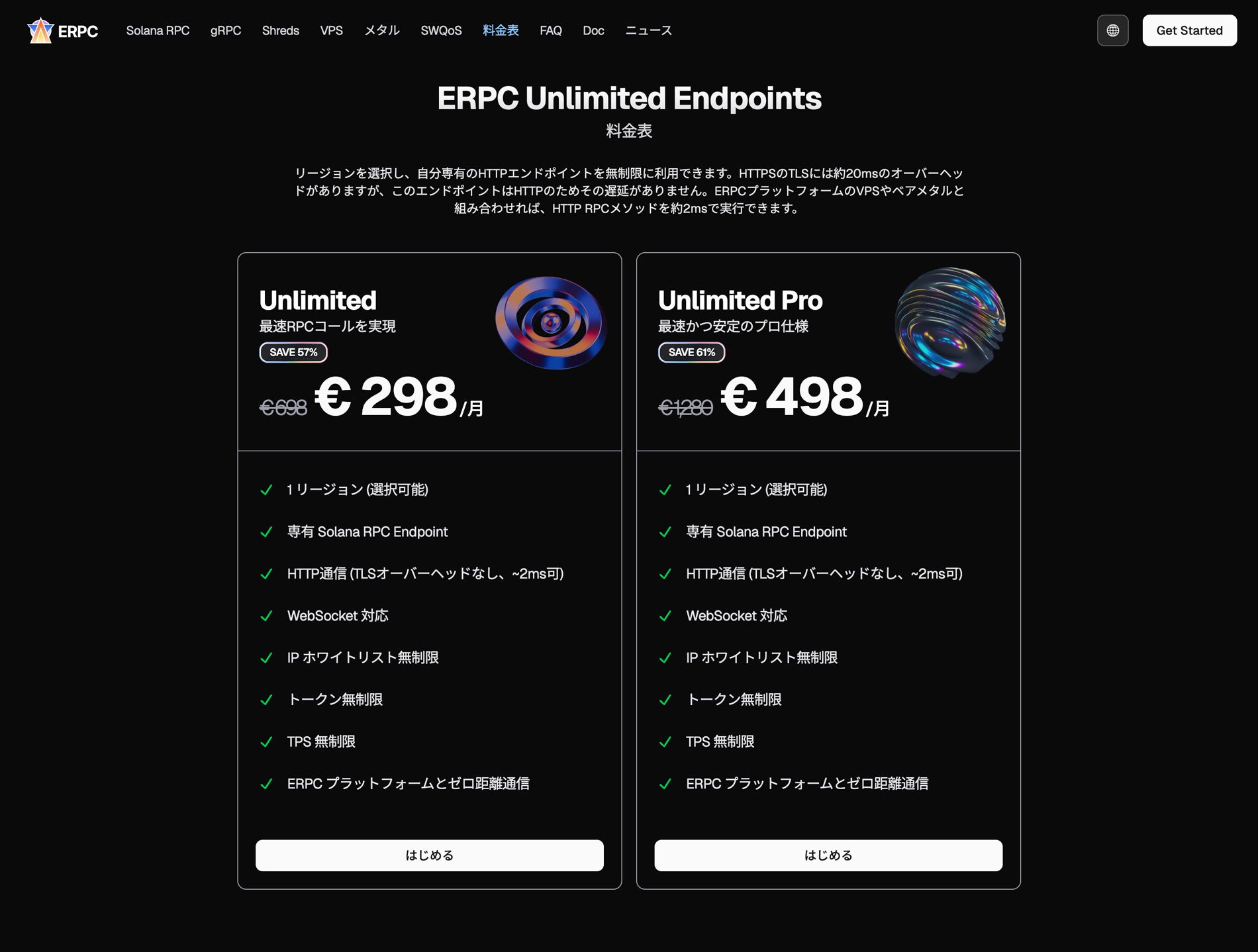 いずれのプランも、1 リージョン選択制、専有 Solana RPC Endpoint、HTTP 通信(TLS オーバーヘッドなし、~2ms 可)、WebSocket 対応、IP ホワイトリスト無制限、トークン無制限、TPS 無制限、ERPC プラットフォームとのゼロ距離通信を標準で備えています。