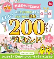 株式会社NTTドコモ(以下、ドコモ)は、「銀行口座チャージ&d払い残高からのお買物で抽選でdポイント10,000ptが500名に当たる!キャンペーン」(以下、本キャンペーン①)を2025年3月3日(月)から2025年3月31日(月)までの期間で、「d払い残高送金で200ポイントもらえるキャンペーン」(以下、本キャンペーン②)を2025年3月10日(月)から2025年4月9日(水)までの期間で開催いたします。