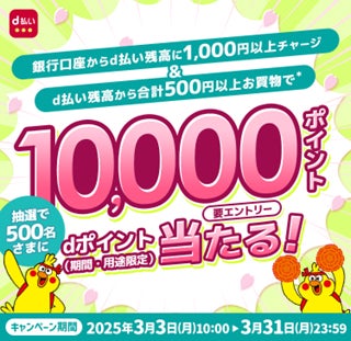 エントリー期間中にキャンペーンサイトからエントリーの上、キャンペーン期間中に銀行口座から「d払い」アプリのd払い残高に1,000円以上チャージし、d払い残高から合計500円(税込)以上お買物※3をしたお客さまの中から、抽選で500名さまにdポイント(期間・用途限定)が10,000ポイント当たります※4。なお、エントリーと「d払い」アプリでのチャージおよびお買物の順序は問いません。 <当選ポイント> 10,000ポイント×500名さま |
