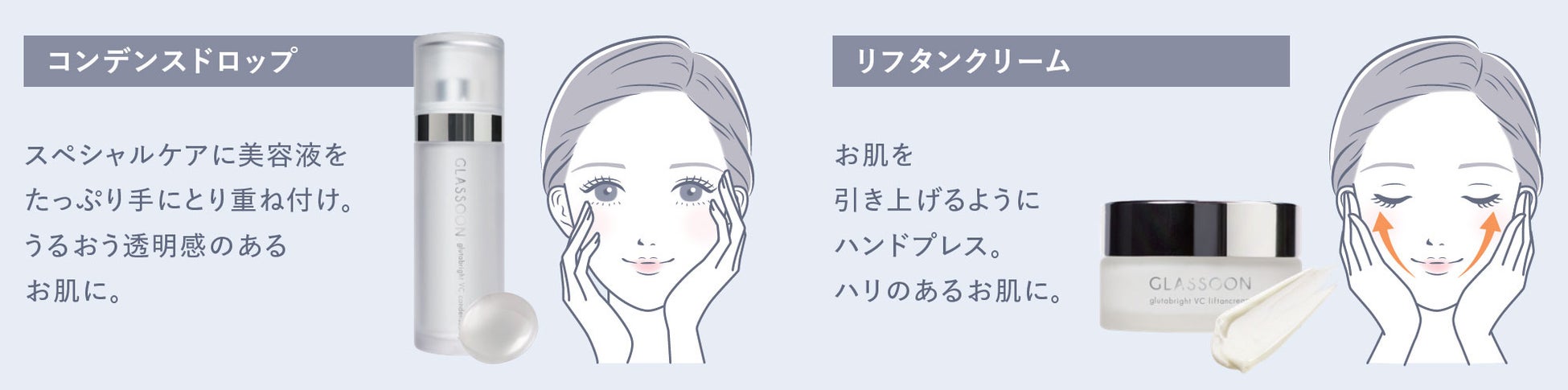スキンケアとして、肌なじみがよくべたつかないテクスチャーで肌悩みにアプローチする濃密集中美容液「グルタブライト VC コンデンスドロップ」と、密着感のあるテクスチャーでハリのあるお肌に導く濃厚密着クリーム「グルタブライト VC リフタンクリーム」を発売いたします。