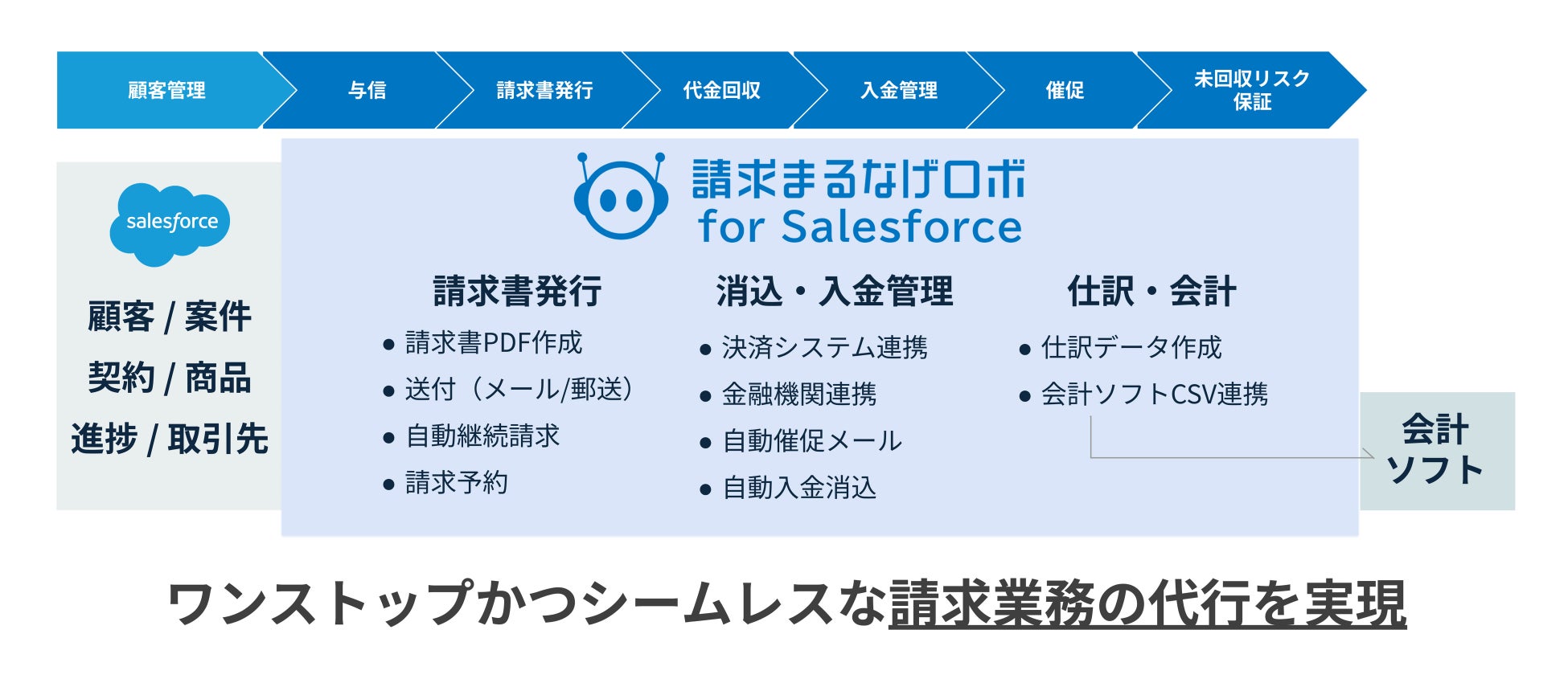 従来提供しています「請求まるなげロボ」に、Salesforce®と連携できるパッケージをラインアップしました。それにより、「請求まるなげロボ」で発生していた初回取引時の情報入力などの作業が無くなり、Salesforce®の商談・顧客情報を起点とした請求業務のアウトソースが可能になります。
