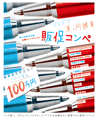 「販促会議 企画コンペティション」は、協賛企業から出される商品・サービスのプロモーションについての課題を受け、解決策となるアイデアを企画書形式で募集するコンテストです。2010年7月から開催を重ね、過去には受賞作品のアイデアが採用され商品化が実現したものもあります。販促コンペはプロモーション手法のさらなる進化、企画力に優れた人材の発掘・育成など、マーケティング・プロモーションに携わる方々の技術向上を目的として開催しています。
