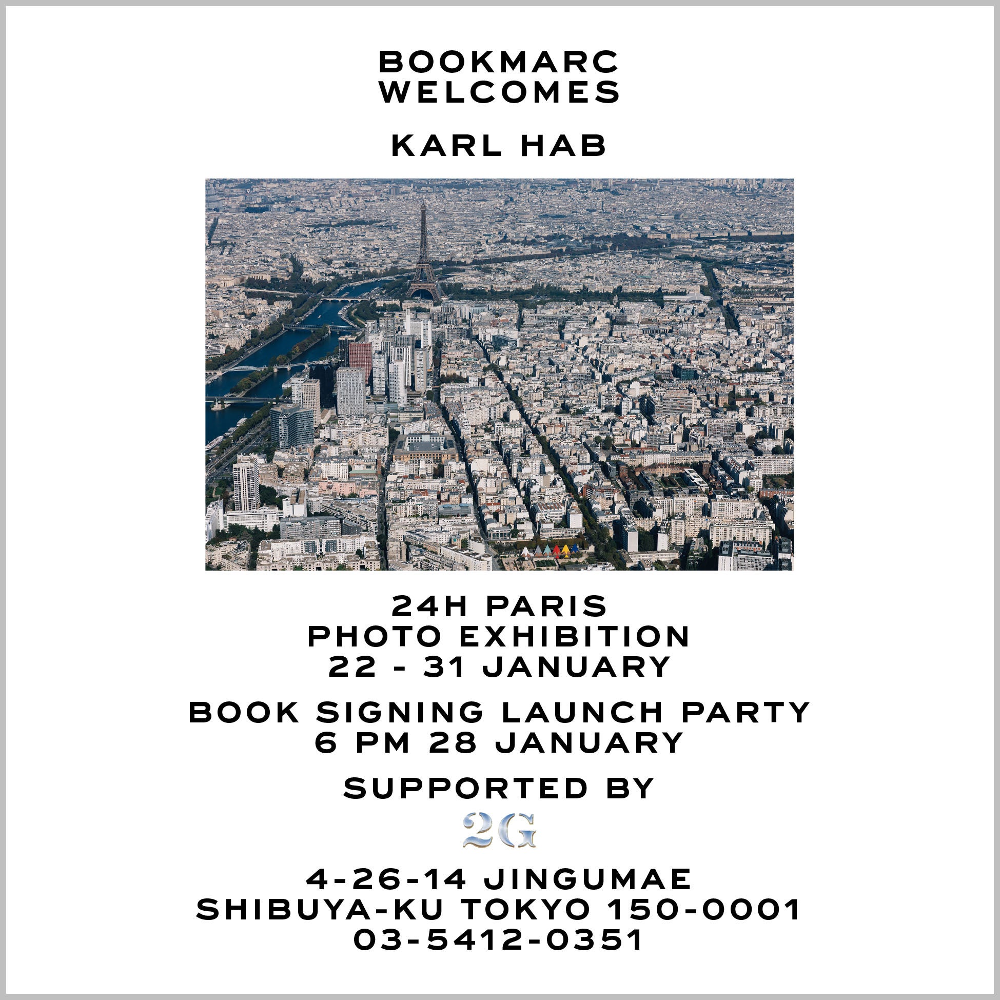ニューヨーク発ファッションブランド「マーク ジェイコブス」が手掛けるブックストア「BOOKMARC(ブックマーク)」にて、パリ拠点の写真家 Karl Hab (カール・ハブ)の写真集『24H PARIS』の日本発売を記念した写真展を開催します。さまざまなショットやアングルから、パリを独自の視点で捉えています。時系列に並んだ色調や色彩が、この街の豊かな表情を表現した写真展になります。28日(土)のレセプションではサイン会も開催します。この展覧会にあわせ『Karl Hab x 2G』のコラボTシャツとトートバッグも販売。皆様のご来店お待ちしております。