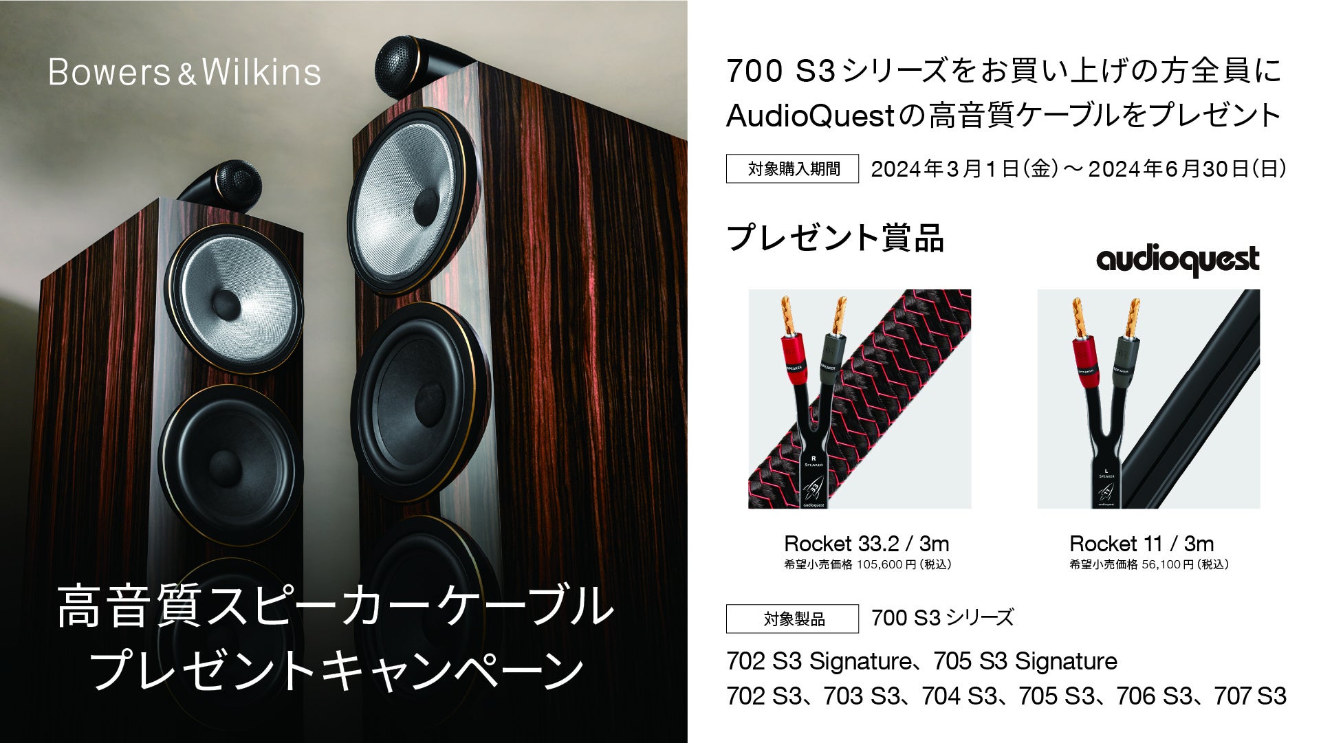 2024年3月1日(金)~ 6月30日(日)の期間で実施中の「700 S3シリーズ」が対象の「高音質スピーカーケーブルプレゼントキャンペーン」の対象製品に702 S3 Signatureおよび705 S3 Signatureを追加いたしました。対象購入期間中に700 Series Signatureおよび700 S3シリーズのステレオスピーカー(1組)をご購入の上、ご応募いただいた方全員に、700 S3シリーズにベストマッチなAudioQuestの高音質スピーカーケーブル「Rocketシリーズ」の「Rocket 33.2」または「Rocket 11」(3m / ペア / シングルバイワイヤ / 金メッキバナナプラグ仕様)をプレゼントいたします。