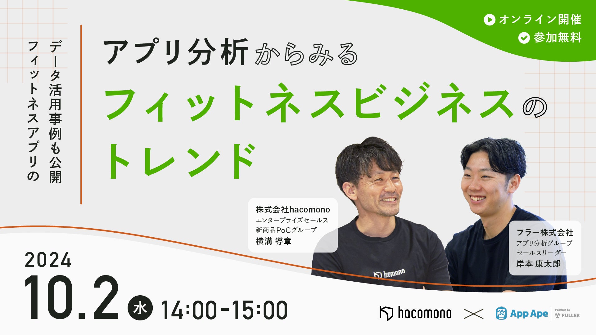 アプリ市場分析サービス「App Ape(アップ・エイプ)」を手がけるフラー株式会社(本社:新潟県新潟市、代表取締役:渋谷修太、山﨑将司、以下「フラー」)と、ウェルネス/運動施設向けオールインワンマネージメントシステム「hacomono」を提供する株式会社hacomono(東京都渋谷区、代表取締役CEO: 蓮田 健一 以下「hacomono」)は、アプリ分析からみるフィットネスビジネスのトレンドをテーマにオンラインセミナーを開催します。