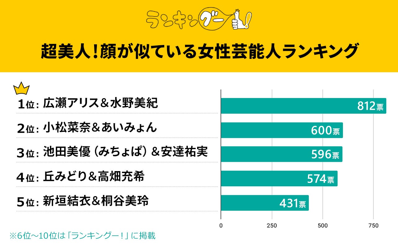 1位はパーツがはっきりとした、華やかな顔立ちが姉妹のようにそっくりな広瀬アリスさん&水野美紀さんに決定!2位はミステリアスな雰囲気が似ている、小松菜奈さん&あいみょんさん。僅差で3位は池田美優さん(みちょぱ)&安達祐実さん。4位は丘みどりさん&高畑充希さん。そして、5位には新垣結衣さん&桐谷美玲さんがランクインしました!