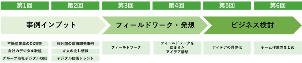 昨年度までに東急不動産の従業員を対象として日本総研と実施した「TLC-X」をベースに、本プログラムを構成しています。全6回で構成される本プログラムは、第1・2回を蓋然性の高い未来及び不確実性の高い未来についての事例インプット、第3回にて北海道石狩市でのフィールドワークを実施、第4回にてフィールドワークを踏まえたアイデア構想、第5・6回にてビジネスアイデアのアウトプットを行います(下図)。本プログラムでは、グループ全体から計約30名が修了する見込みです。