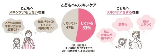 そして「マー&ミー」は、おやこのバスタイムをお風呂の中だけではなく、お風呂あがりまで続くものとして捉え、ママと子ども、2人にうれしい「スキンケア」を考えました。3歳~10歳の子どもへのスキンケア実施状況(2021年当社調べ)は、子どもへのスキンケアをしている人としていない人がほぼ同数でした。子どもへのスキンケアをしている理由は、カサつきや肌荒れといった顕在化した肌悩みの対応として、という声が多い一方、していない理由は、子どもの肌はきれいだから必要ない、毎日バタバタしていて時間がないという声が多く聞かれました。
