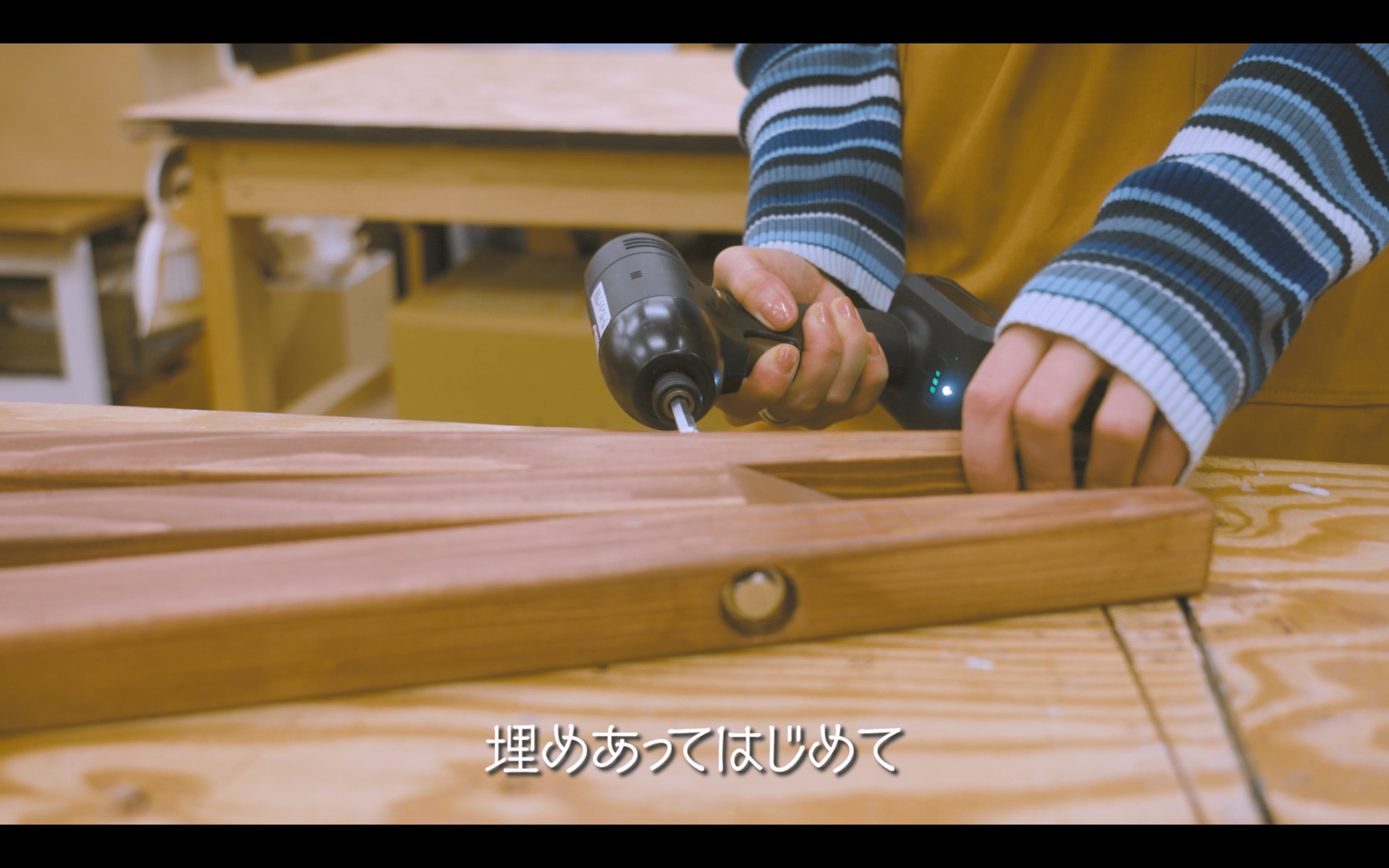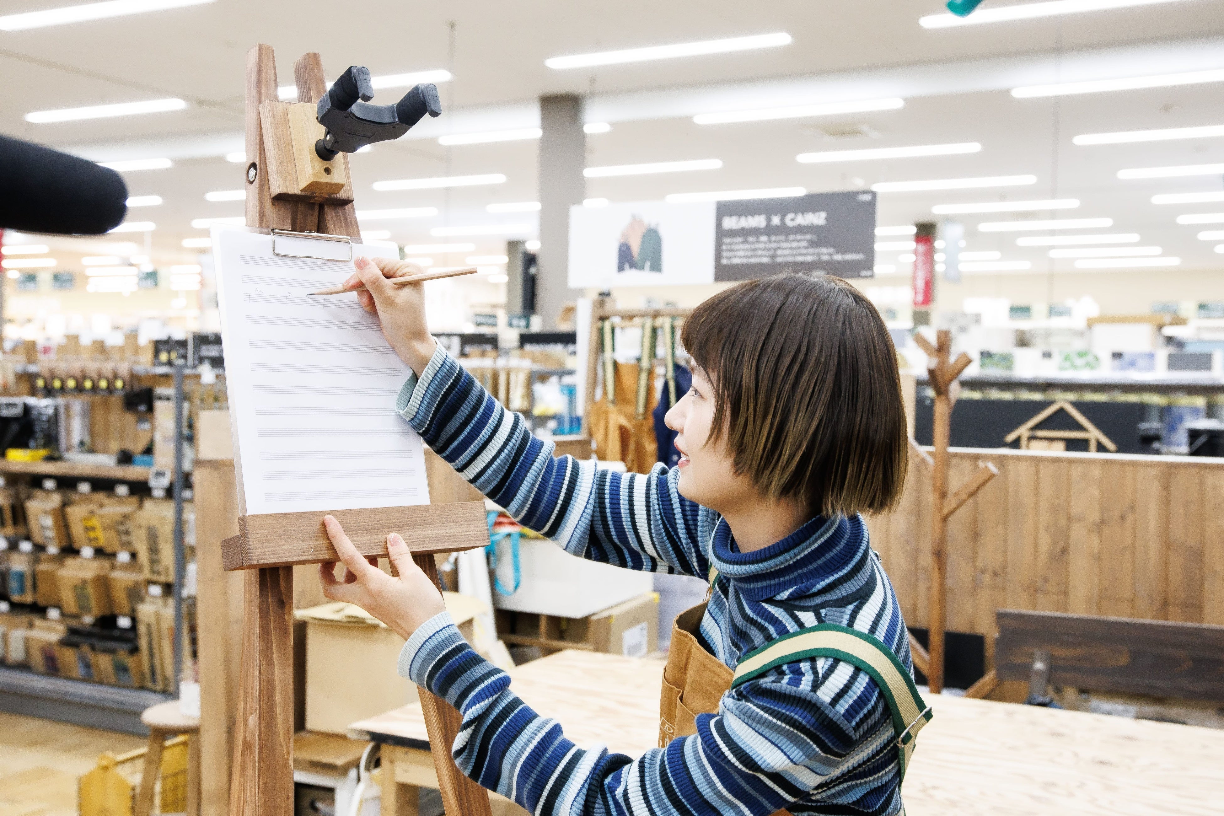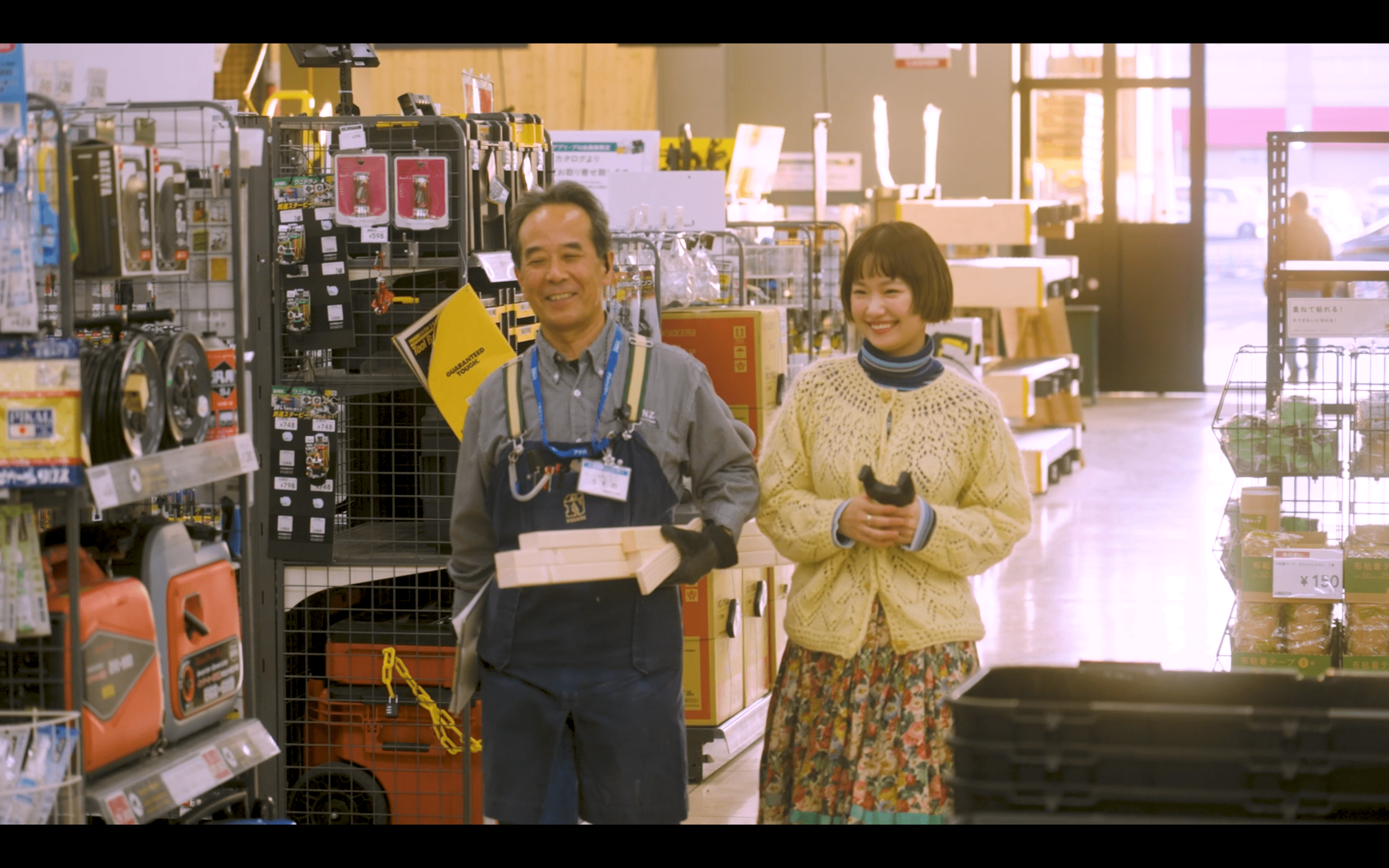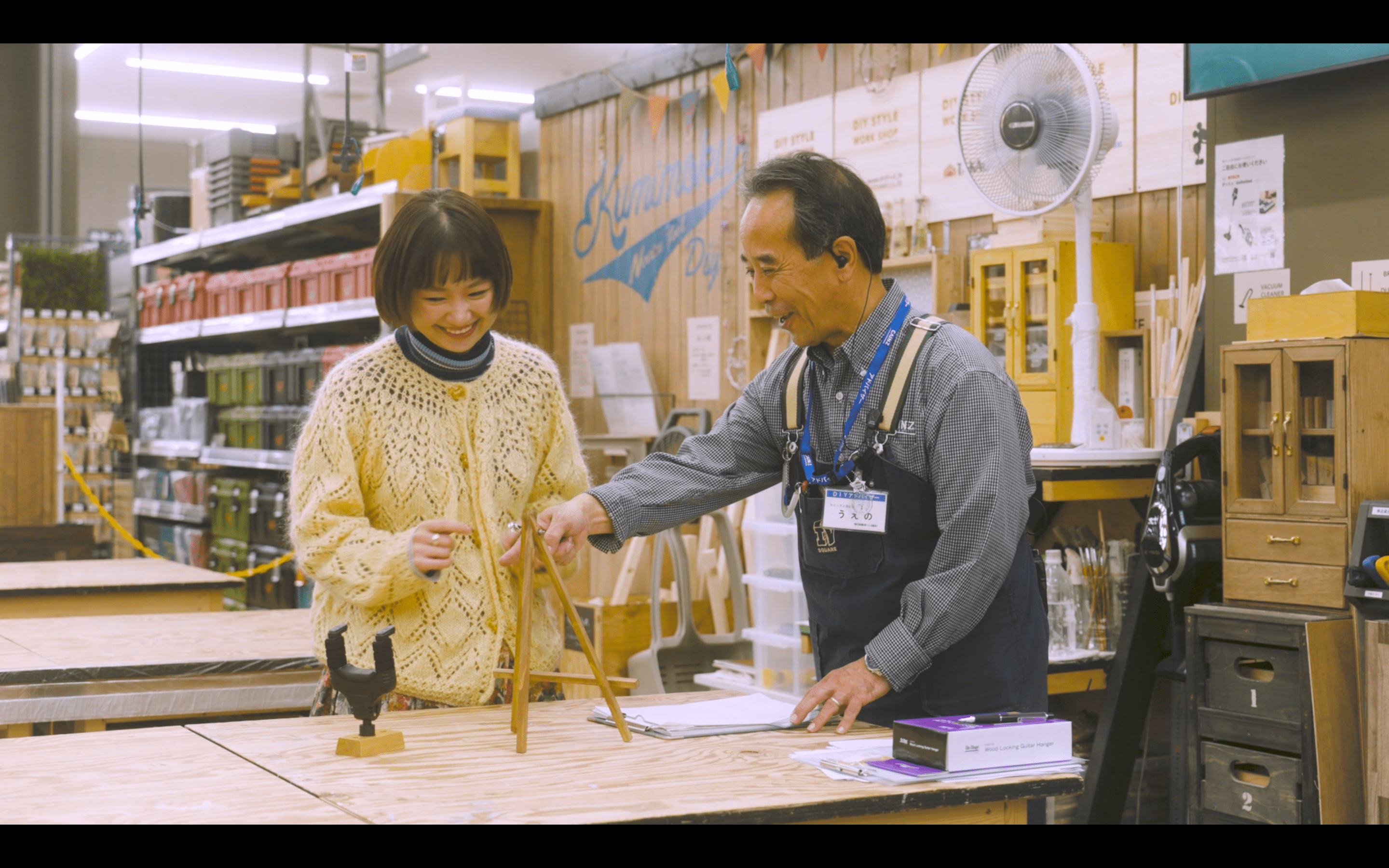 自分だけのオリジナルギタースタンドを夢見る女性を題材にしたショートストーリー。壁掛け用ギターハンガーを手にしたお客様がカインズを訪れ、DIY専門のメンバー(従業員)に相談。設計や材料選び、木材の加工を経て、イーゼル型ギタースタンドが完成に至るまでをドラマ仕立てにしながら、演奏シーンを交えたミュージックビデオ作品に仕上げました。