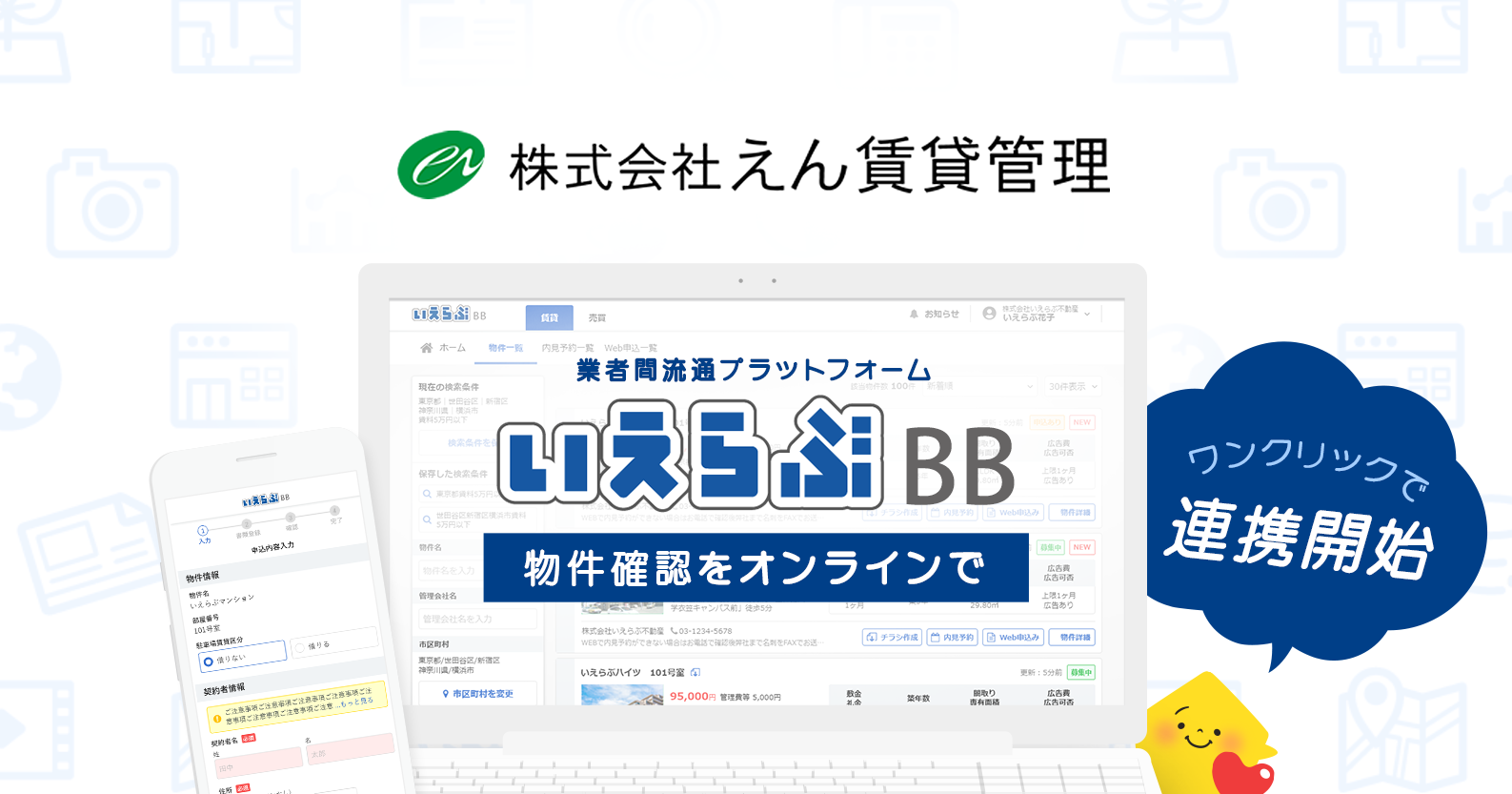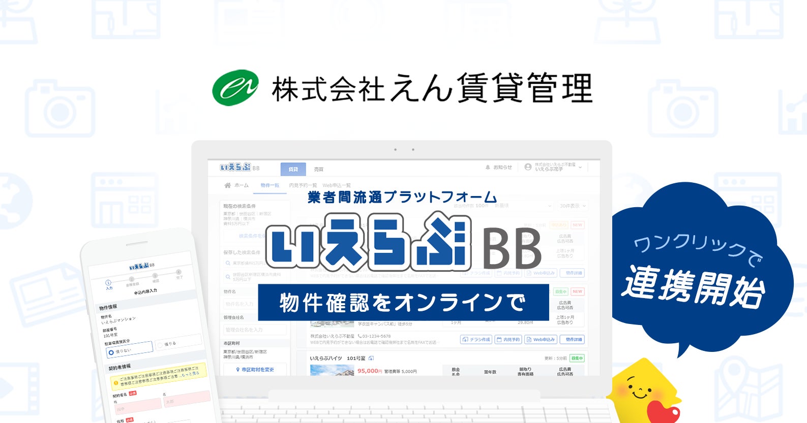 えん賃貸管理では2024年2月より、不動産の業者間流通プラットフォーム「いえらぶBB」への掲載を開始しました。これにより「いえらぶBB」を利用する全国の賃貸仲介会社は、えん賃貸管理が管理する物件の空室状況をオンラインで確認し、ワンクリックで物件データの取込やポータルサイトへの掲載ができるようになります。