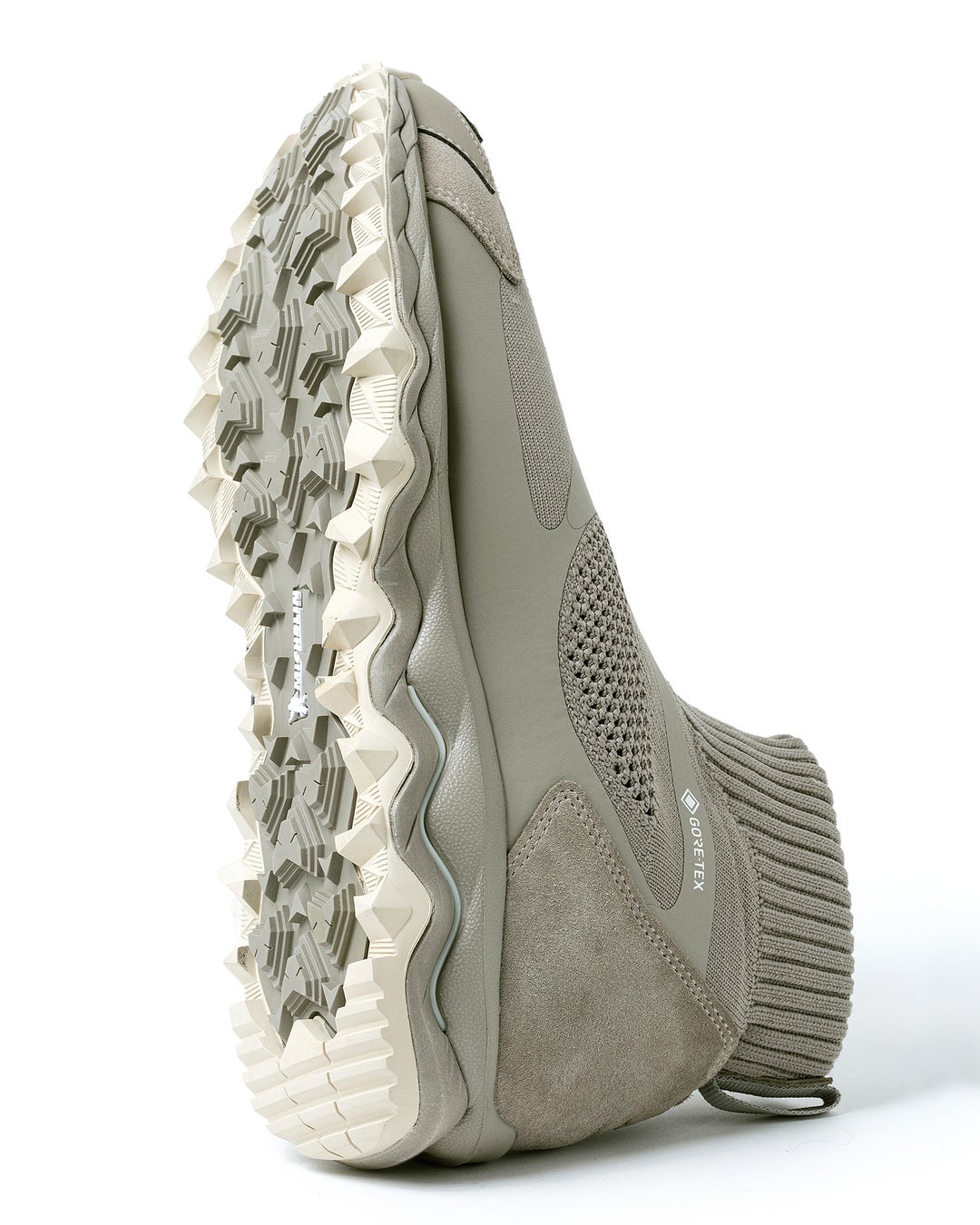 「WAVE MUJIN TL MID GTX nonnative」は、「WAVE MUJIN TL GTX」をベースに、「nonnative」のスタイルに合うようにアレンジしたシューズです。<ゴアテックスファブリクスを搭載したミッドカットのブーツシルエットで、シューレースのないスニーカー>づくりをコンセプトに、約4年の製作期間を費やして完成したシューズは、見た目にも新しいだけでなく、機能性も優れたシューズです。ゴアテックスファブリクスの防水透湿性能を備えながらも、アッパーは伸縮性に優れているので、着脱も容易にできます。また、ヴィンテージカーキのワントーンで仕上げることでコーディネートの幅も広がり、シーンを選ばず履いていただけます。
