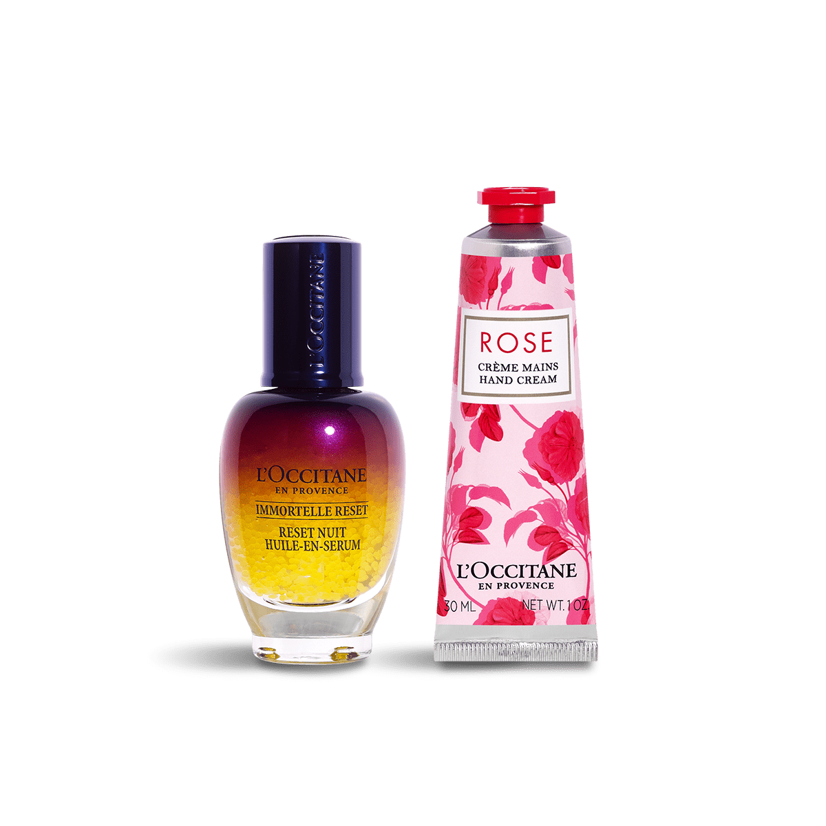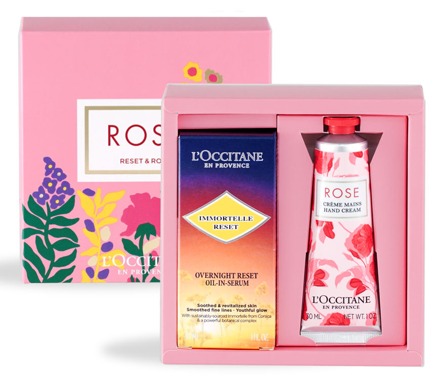 2つ目にご紹介するのは、「ローズ」シリーズのハンドクリームと、ロクシタンのスキンケア人気No.1*の夜用美容液「イモーテル オーバーナイトリセットセラム」が可愛いボックスに入った「リセット&ローズ」。寝ている間にお肌を集中ケアし、翌朝、熟睡した次の日のようなうるおい満ちた肌へ導く夜用美容液は、仕事や家事に忙しいお母さんに喜ばれること間違いなしのアイテムです。