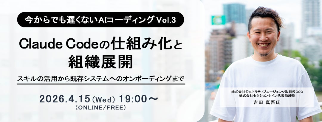 ITエンジニア向けウェビナー 今からでも遅くないAIコーディングVol.3『 Claude Codeの仕組み化と組織展開 ~スキルの活用から既存システムへのオンボーディングまで~』