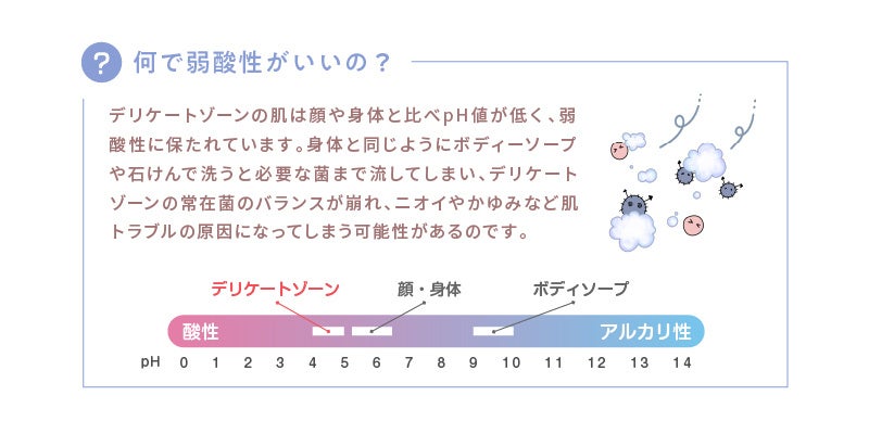 デリケートゾーンの常在菌をサポートする乳酸菌※、クロレラエキス、ENBコンプレックスを配合。さらに、デリケートゾーンのpH値に合わせた弱酸性設計にすることで、デリケートゾーンの適切な肌状態を目指します。