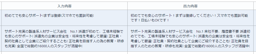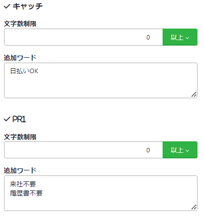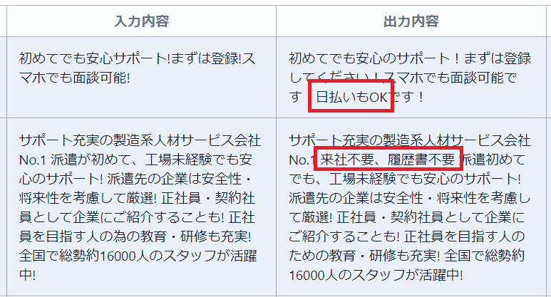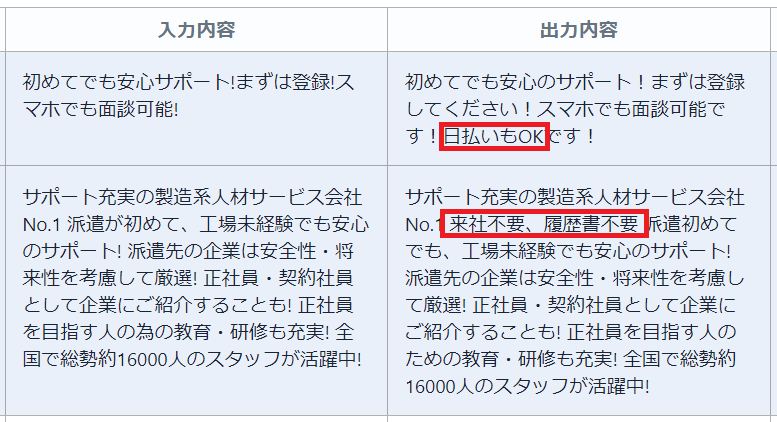 本機能を利用することでタイトルやおすすめポイントに「日払い可能」「来社不要」等の応募者に訴求したい追加ワードを設定し、 生成結果に反映させるという運用が可能になります。