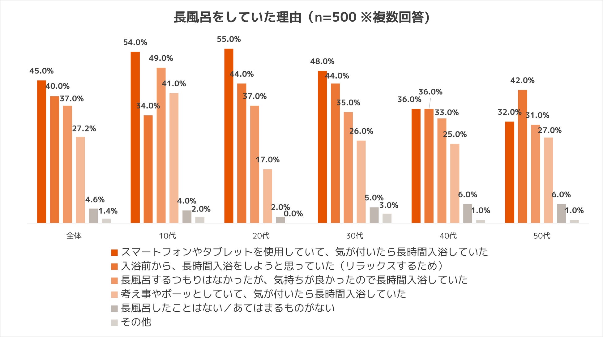 長風呂をしていた理由として、「スマートフォンやタブレットを使用していて、気が付いたら長時間入浴していた」という人が45.0%と最も多い結果に。特に10代~20代は、5割以上が長風呂の理由にスマホ利用を挙げていました。一方、30代や50代では入浴前からリラックスを目的に長風呂を楽しもうとする人も多いことがわかりました。