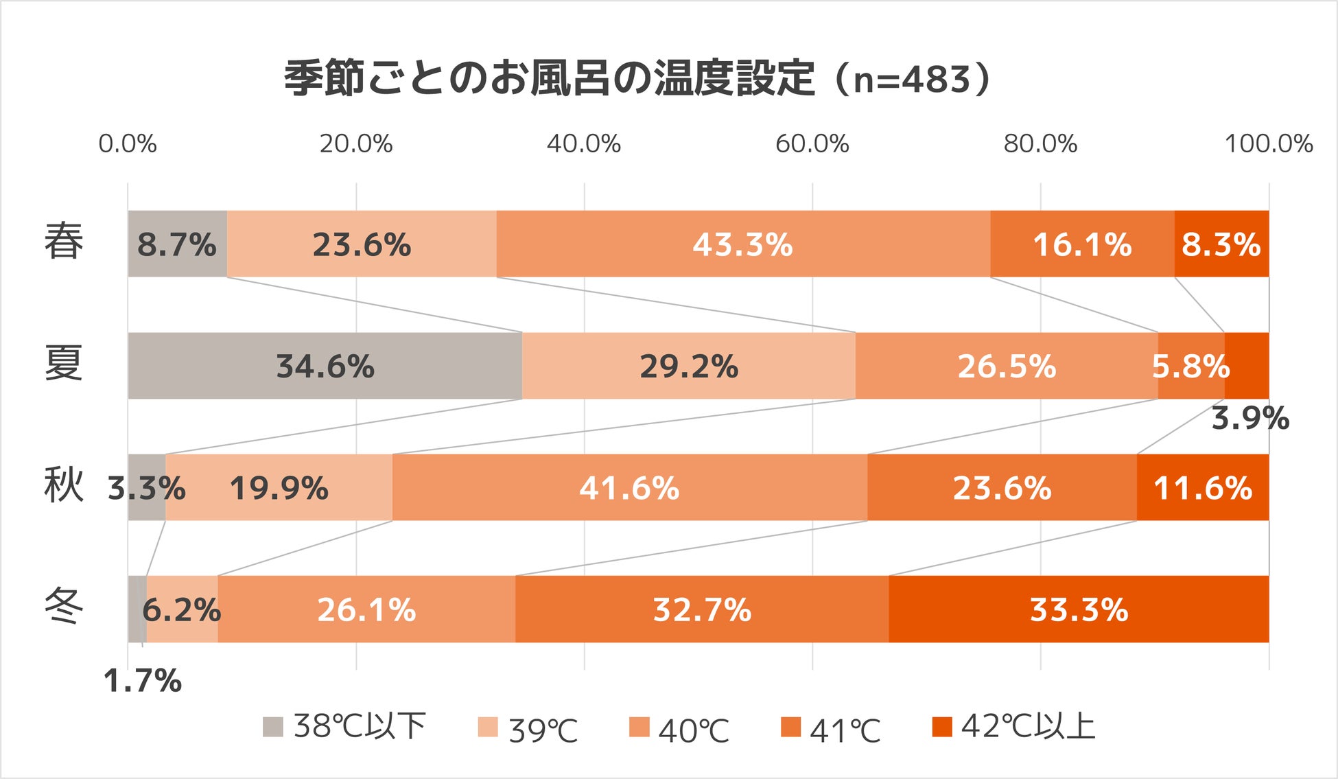 入浴時の温度設定では、気温が低くなるほど熱めに設定している人が多く、冬の時期は66.0%の人が41℃~42℃以上で設定をしています。特に、冬に「42℃以上」に設定をしている人は、入浴中に毎回スマホなどを使用している人で38.5%と最も多く、全体平均よりも5.3ポイント高い結果となりました。寒い季節になるほど、熱めのお湯に浸かって身体を温めながら、入浴時間を楽しみたい様子がうかがえます。