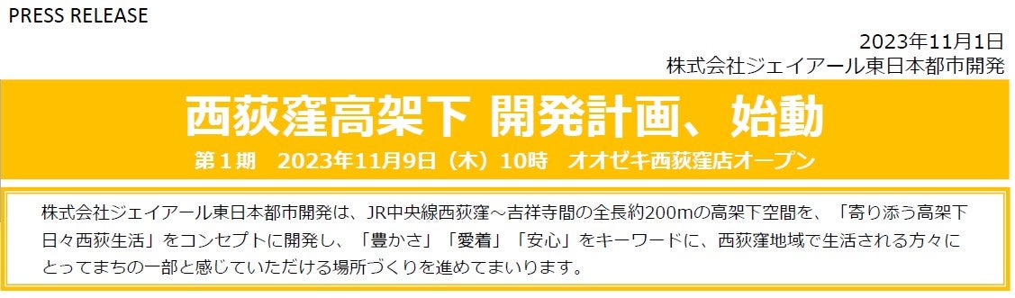 株式会社ジェイアール東日本都市開発は、JR中央線西荻窪~吉祥寺間の全長約200mの高架下空間を、「寄り添う高架下 日々西荻生活」をコンセプトに開発し、「豊かさ」「愛着」「安心」をキーワードに、西荻窪地域で生活される方々にとってまちの一部と感じていただける場所づくりを進めてまいります。