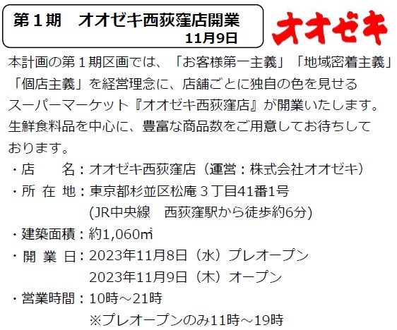 本計画の第1期区画では、「お客様第一主義」「地域密着主義」「個店主義」を経営理念に、店舗ごとに独自の色を見せるスーパーマーケット『オオゼキ西荻窪店』が開業いたします。