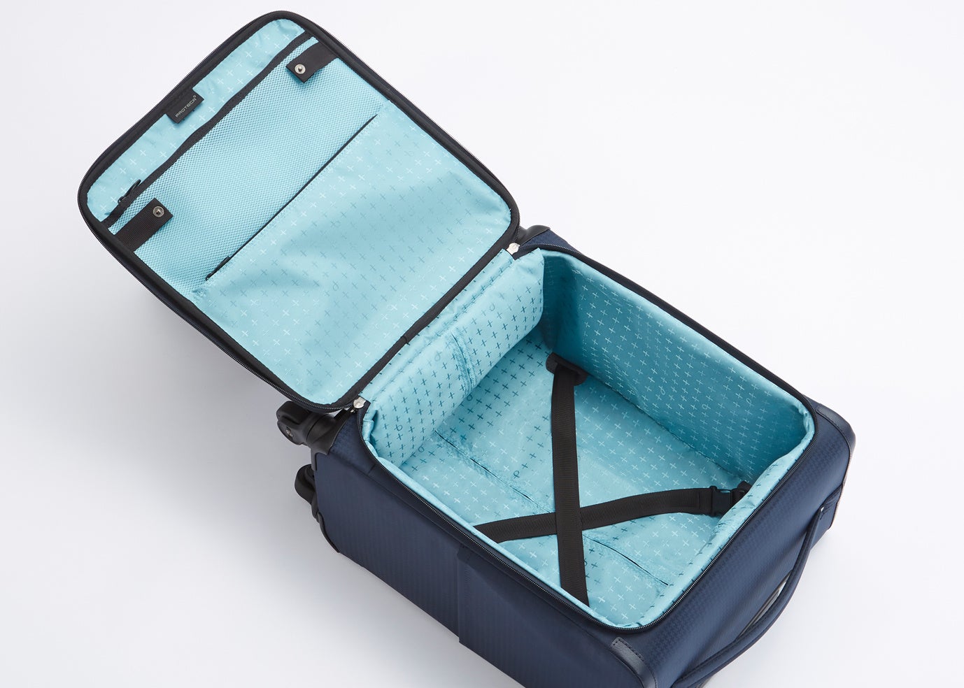 ファスナーポケットや荷物を固定するバンドを装備した充実の内装。サイドストラップが付属しており、移動中の荷物の出し入れも簡単に行えます。