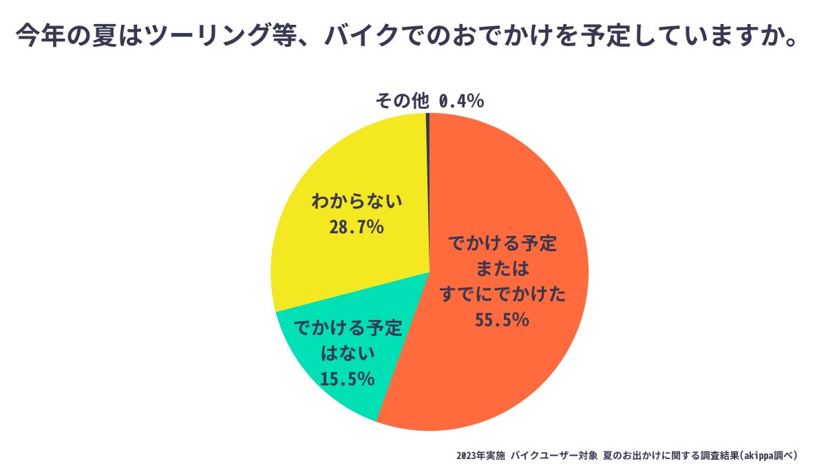 今年の夏、バイクでのおでかけを予定しているか聞いたところ昨年同様「でかける予定、またはすでにでかけた」(55.5%)が半数以上を占める結果となりました。
