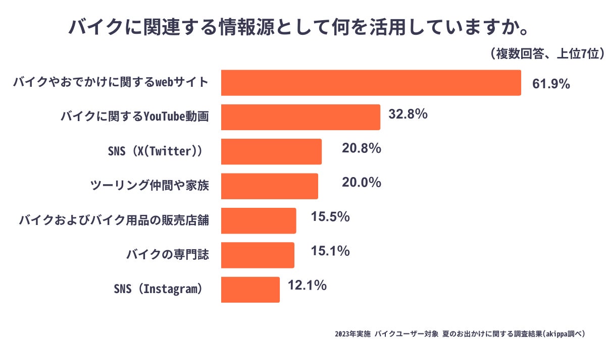 日頃バイクに関する情報源(駐車場情報を含む)として何を活用しているか聞いたところ、「バイクやおでかけに関するWebサイト」(61.9%)が6割以上と多数でした。