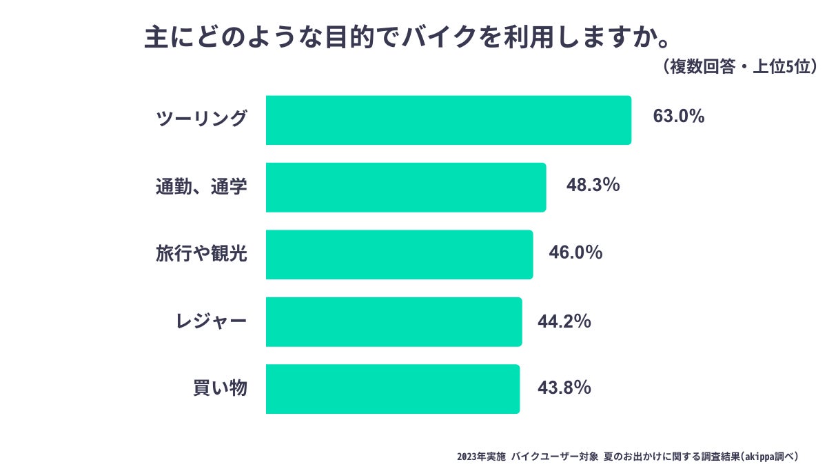 バイクを利用する目的を聞いたところ「ツーリング」(63.0%)、「旅行や観光」(46.0%)、「レジャー」(44.2%)などおでかけ目的で利用する方が多いことがわかりました。