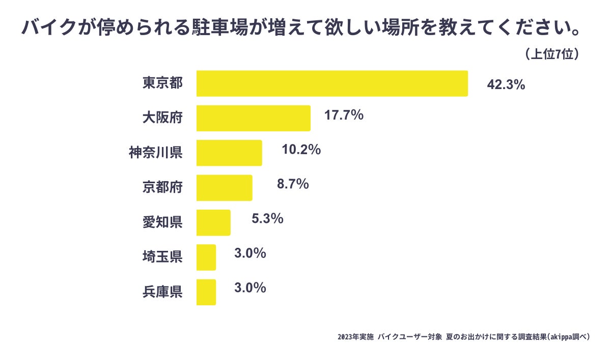 前回の調査でも「目的地にバイク駐車場がない」という回答が多かったため、バイクが停められる駐車場が増えて欲しい場所を聞いた結果、「東京都」(42.3%)が圧倒的第1位となりました。特に「23区内」や都心3区(千代田区、中央区、港区)に欲しいという声が多く「駐輪場の数自体が少ない」「仕事や通勤で頻繁に利用したい」「取り締まりが多いので確実に駐輪場に停めたい」といった理由が挙げられていました。