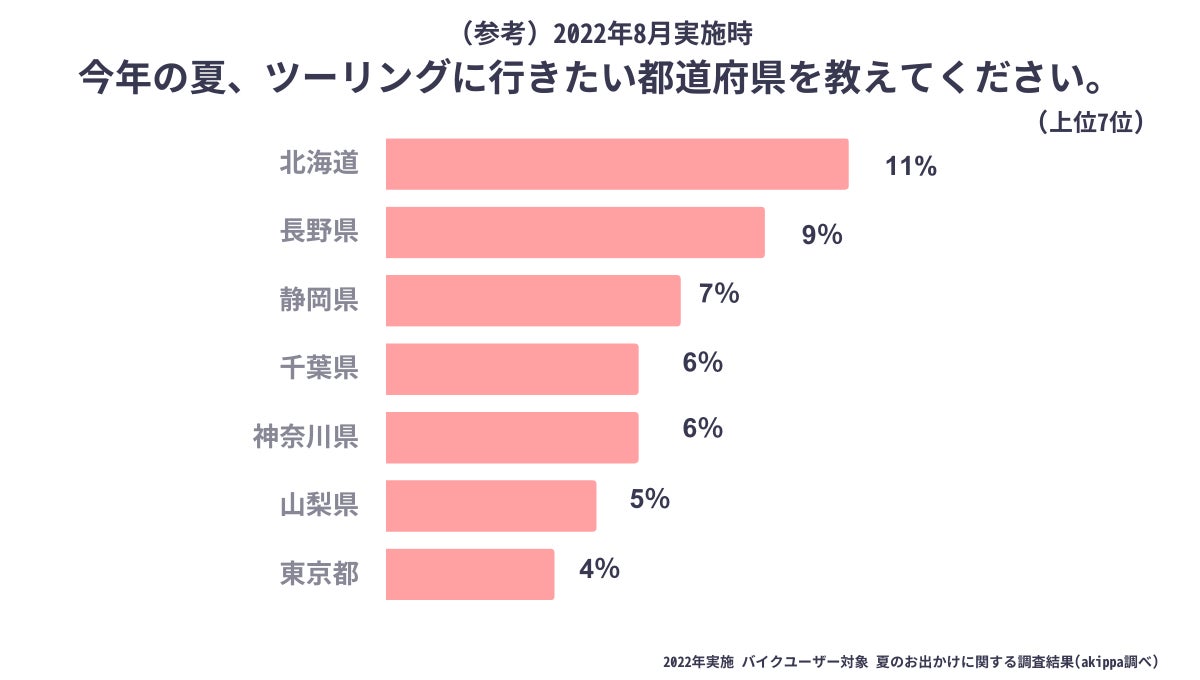 今年の夏、ツーリングに行きたい場所を聞いたところ、順位の変動はあったものの上位5位は昨年と変わらない結果となりました。「長野県」(11.3%)「北海道」(7.6%)など自然豊かで避暑地の印象があるエリアの人気が伺えました。また第6位に「滋賀県」(5.3%)が西日本エリアで唯一ランクインしています。
