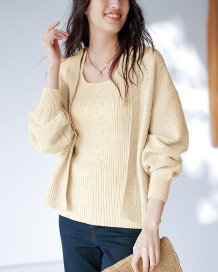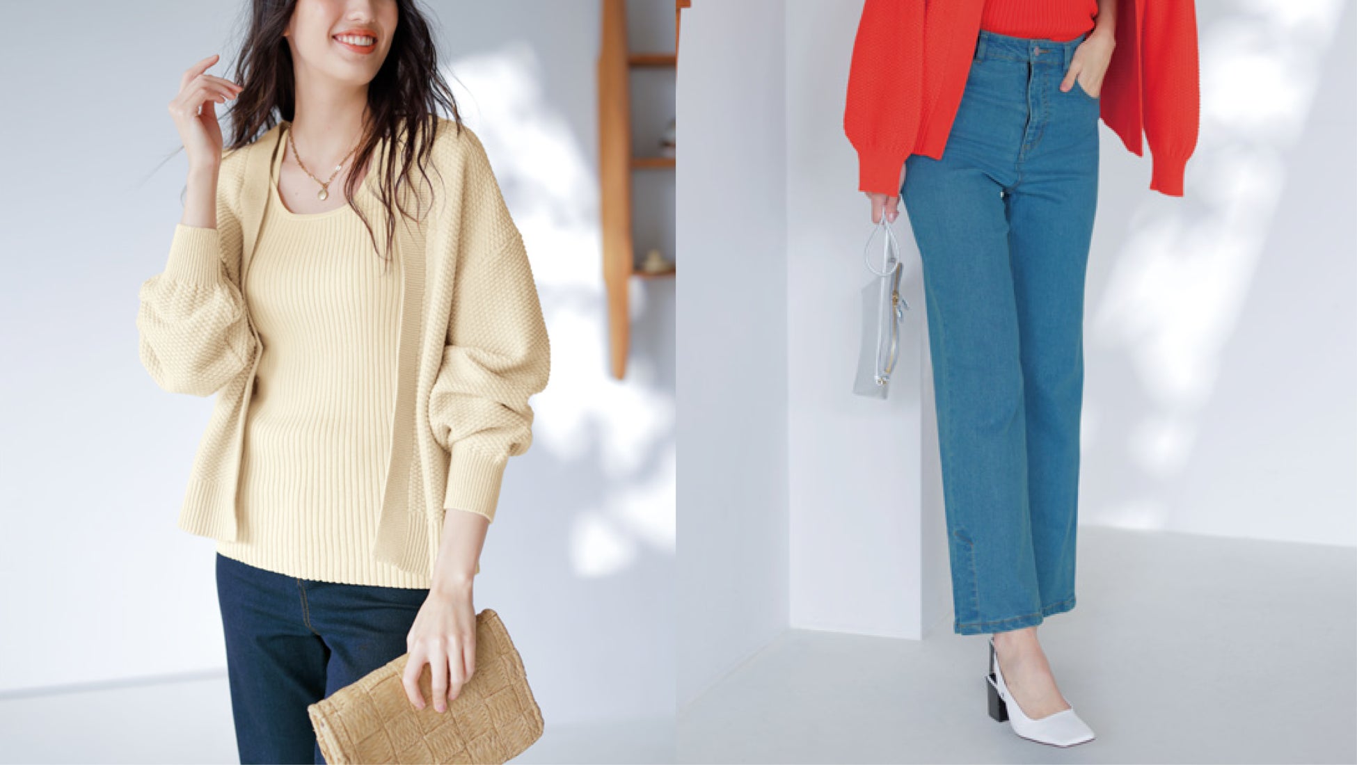 今回紹介するのは、主にペットボトルを再利用して作られたエコ素材・リサイクルポリエステル使用の「ざっくりニットカーディガン」、「重ね着風ニットタンクトップ」、「サイドスリット入りストレートデニムパンツ」の3点です。今シーズンの新商品として登場した3商品は、カラー展開やシルエットによりトレンド感とスタイルアップ効果を意識したファッション性がありながらも、快適な着心地にもこだわった、地球にも自分にもうれしいサステナブルアイテムです。