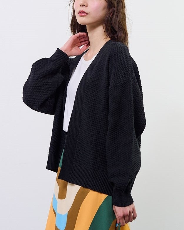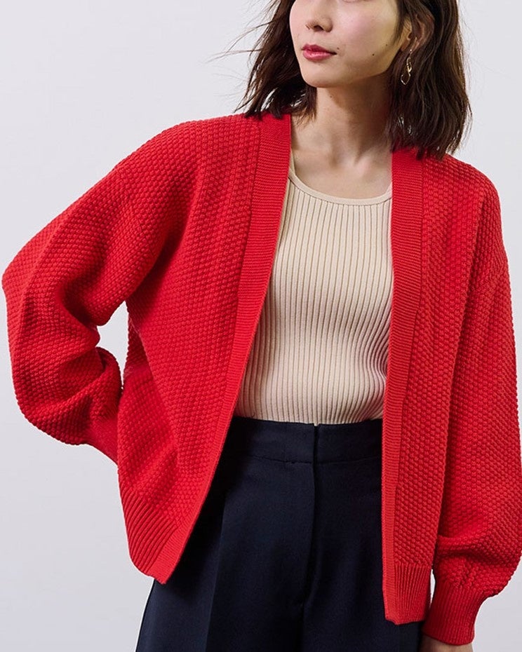 ■特長:リサイクルポリエステルを混紡したエコ素材で編みたてたニットカーディガン。トレンドからベーシックまで豊富な色展開がポイント。ミドルゲージのざっくり編地で、タンクトップやTシャツに羽織れる便利な1枚です。