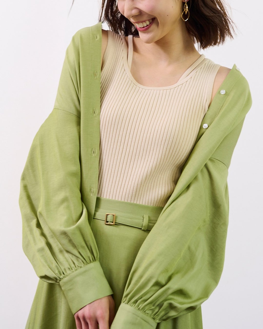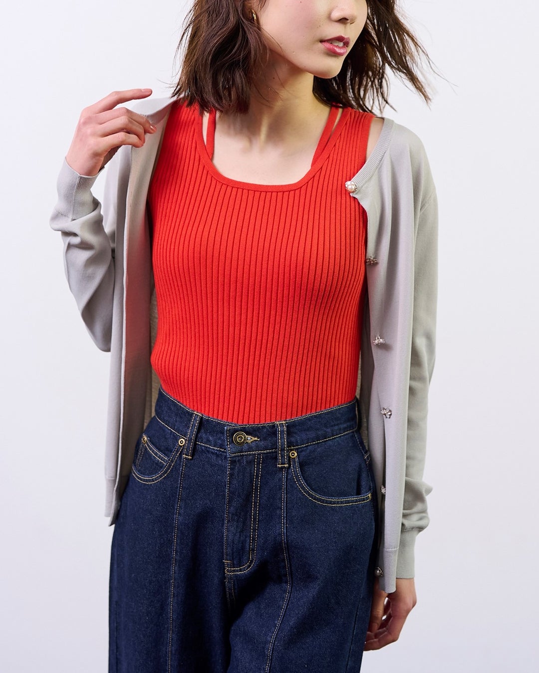 ■特長:リサイクルポリエステルを混紡したエコ素材を編み立てたニットタンクトップ。バックのストラップアクセントを効かせたひと癖デザインがポイント。春はインナーとして、夏は1枚で着られてロングシーズン活躍します。