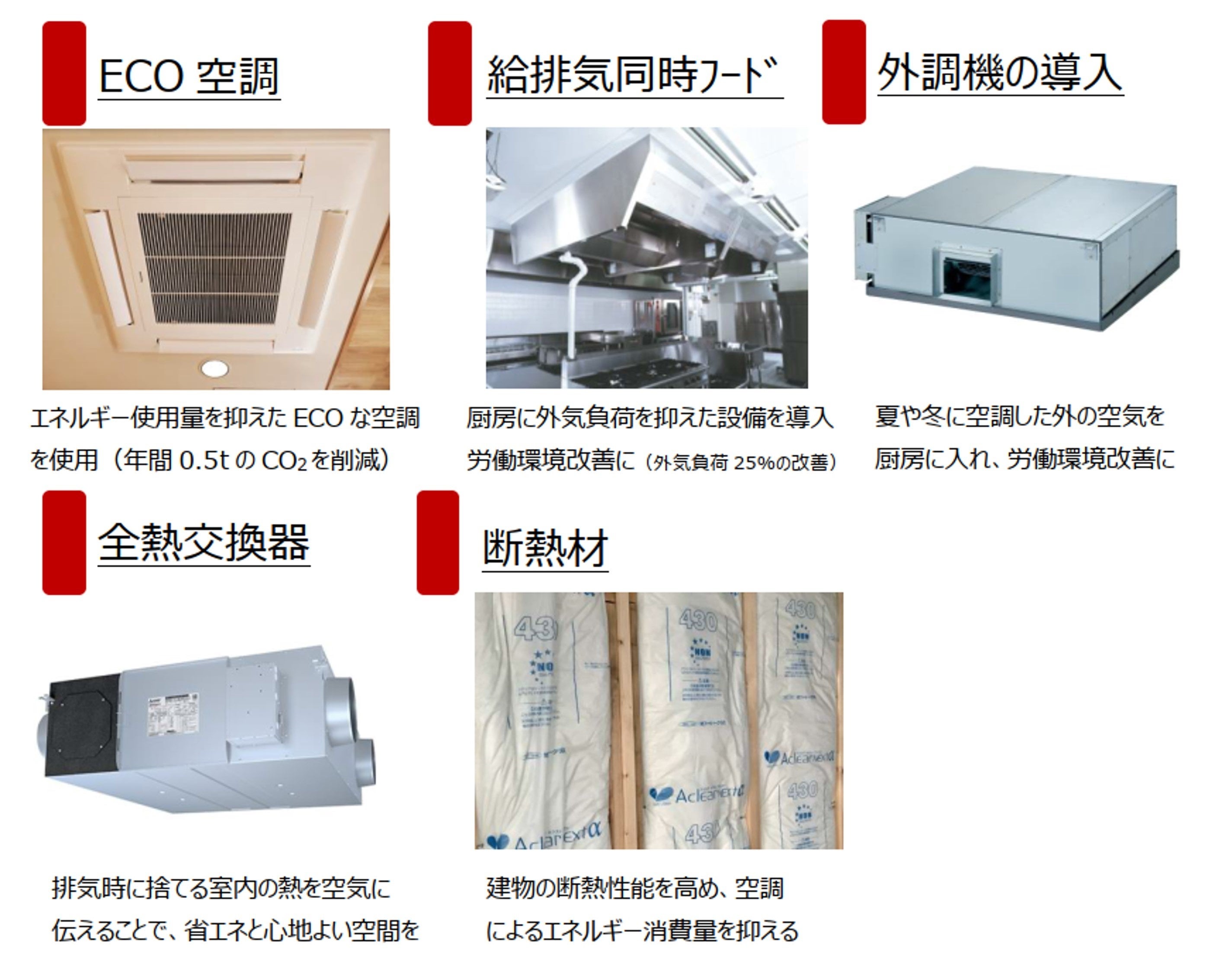 店舗屋根部分に54.72kWh太陽光発電設備を設置し、省エネルギー化を実現しています。そこで発電される電気は全て当店舗運営に充てており、全電気量の30%量に相当します。(※8月末からの稼働を予定しています)