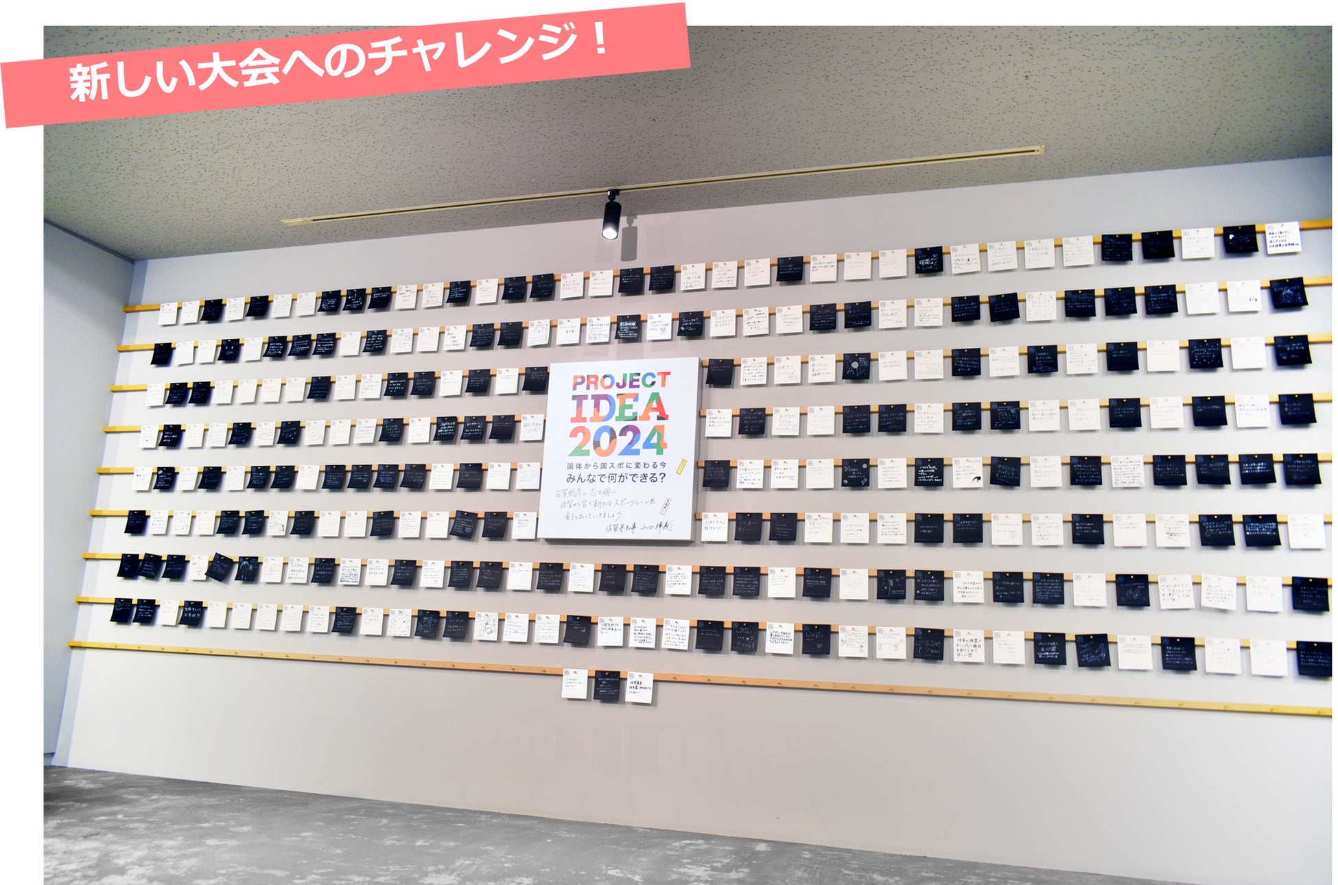 「国体」から「国スポ」に変わるはじめての大会を“みんなで”つくり上げるプロジェクト『IDEA2024』。“スポーツ”だからできる、大会のあり方を変えるアイデアを募集し、目標数(2024アイデア)を上回る2,106アイデアの応募が寄せられました。(写真は県庁に張り出されたみんなの手書きアイデアボード)