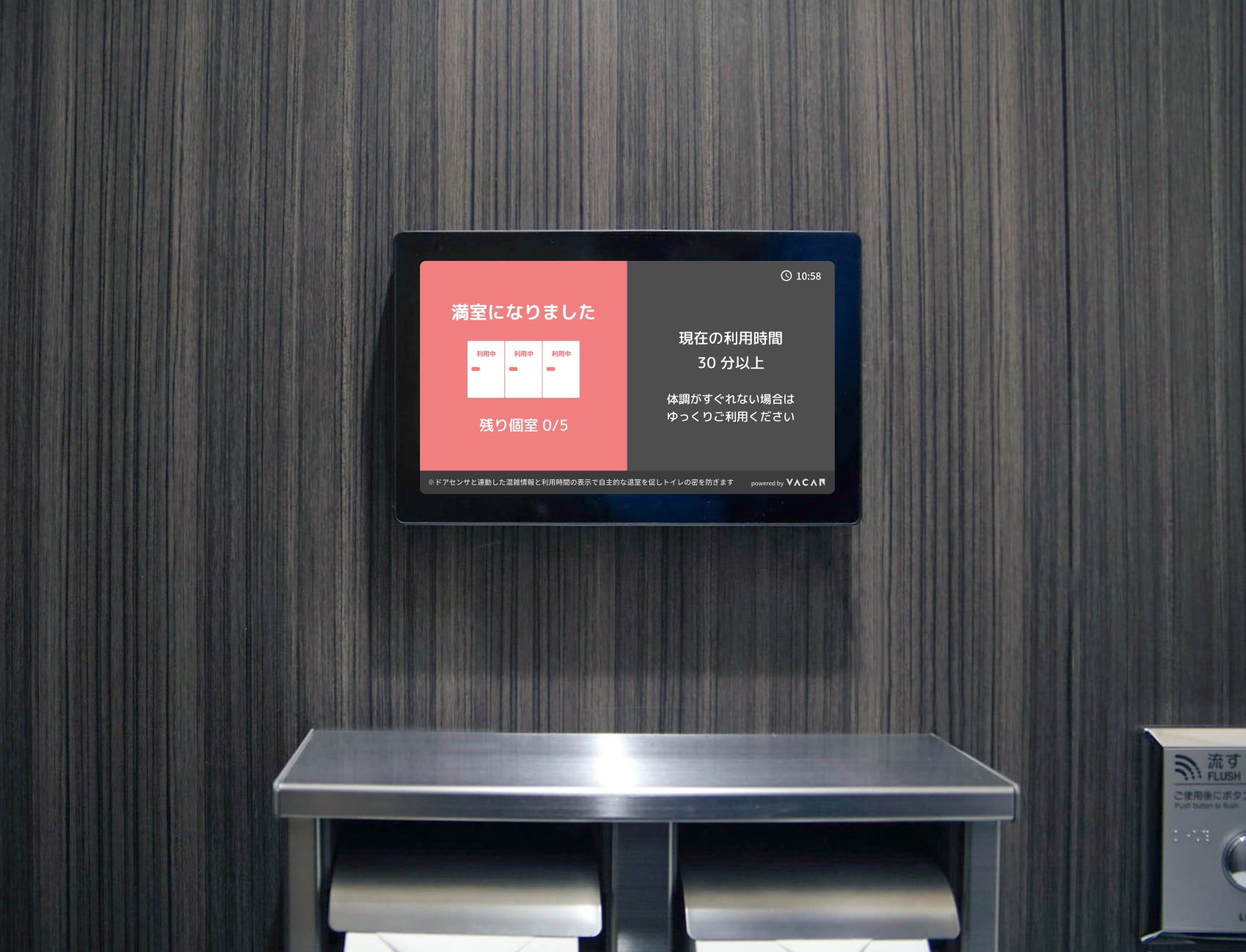AirKnock(エアノック)は、センサーで個室の利用状況をリアルタイムに検知し、個室内モニターで利用時間や混雑状況を可視化します。混雑時や長時間利用時には画面表示を切り替え、譲り合い利用を促進することで、利用者に配慮しながら混雑と長時間滞在を抑止するトイレDXサービスです。