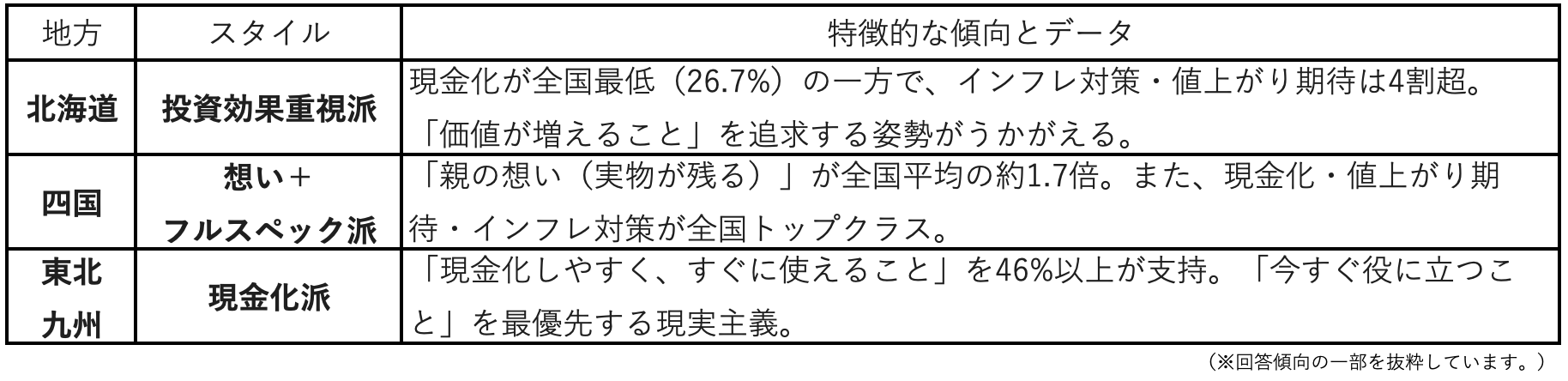 「親の想い(実物が残る)」が全国平均の約1.7倍。また、現金化・値上がり期待・インフレ対策が全国トップクラス。 |