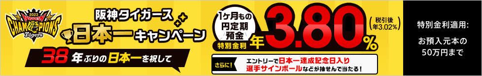 特典内容 | 【特別金利】 1カ月もの円定期預金金利 年3.8%(税引後 年3.02%) ※特別金利の適用は、お預入元本合計50万円までとなります。 【追加景品】 適用条件を満たしたお客さまのうち、抽せんで以下をプレゼント ①日本一達成記念日入り選手サインボール:38名 ②甲子園歴史館入場券:50 組100名 |