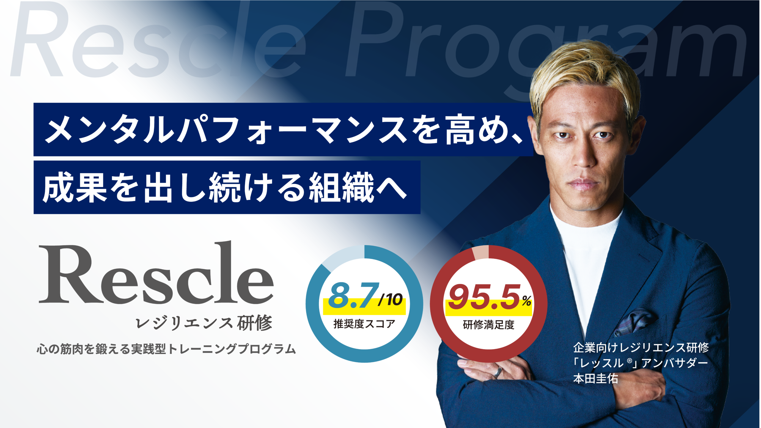 FCEでは、こうした課題に対し「しなやかに立ち直る力=レジリエンス」を鍛える企業向けレジリエンス研修「レッスル®」を開発しました。2025年12月には、その理念を体現する存在として本田圭佑氏をアンバサダーに迎え、2026年1月にはパートナー企業の募集を開始しています。多くの企業様よりお問い合わせをいただいております。こうした中、パートナー企業の営業活動をより円滑に進められるよう支援体制を強化する一環として、本田圭佑氏の肖像を活用した営業ツールの提供を開始します。