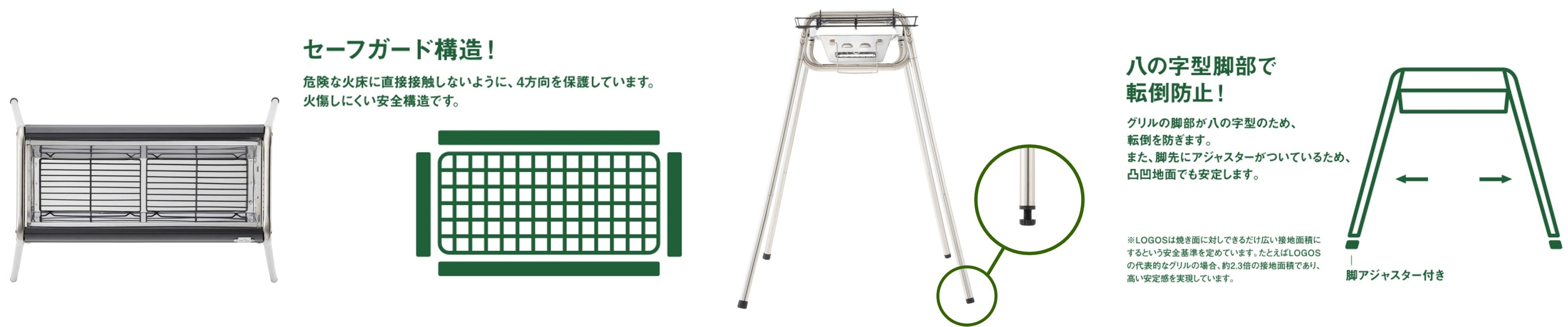 また、本アイテムはBBQをより美味しく安全に楽しむためのLOGOSのこだわりとしてエコロゴセーブ機能を採用しています。ロストル(炭を置く網)を標準装備し、空気の循環をスムーズにすることで不完全燃焼を防止するほか、台形にデザインされた火床は炭の量を最適化します。さらに、火床に直接接触しないよう本体の4方向を保護しているため、火傷のリスクが低く安心です。脚部はグリルの転倒を防ぐために八の字型に設計されており、脚先にはアジャスターも付いているので、凹凸地面でも安定して使用できます。