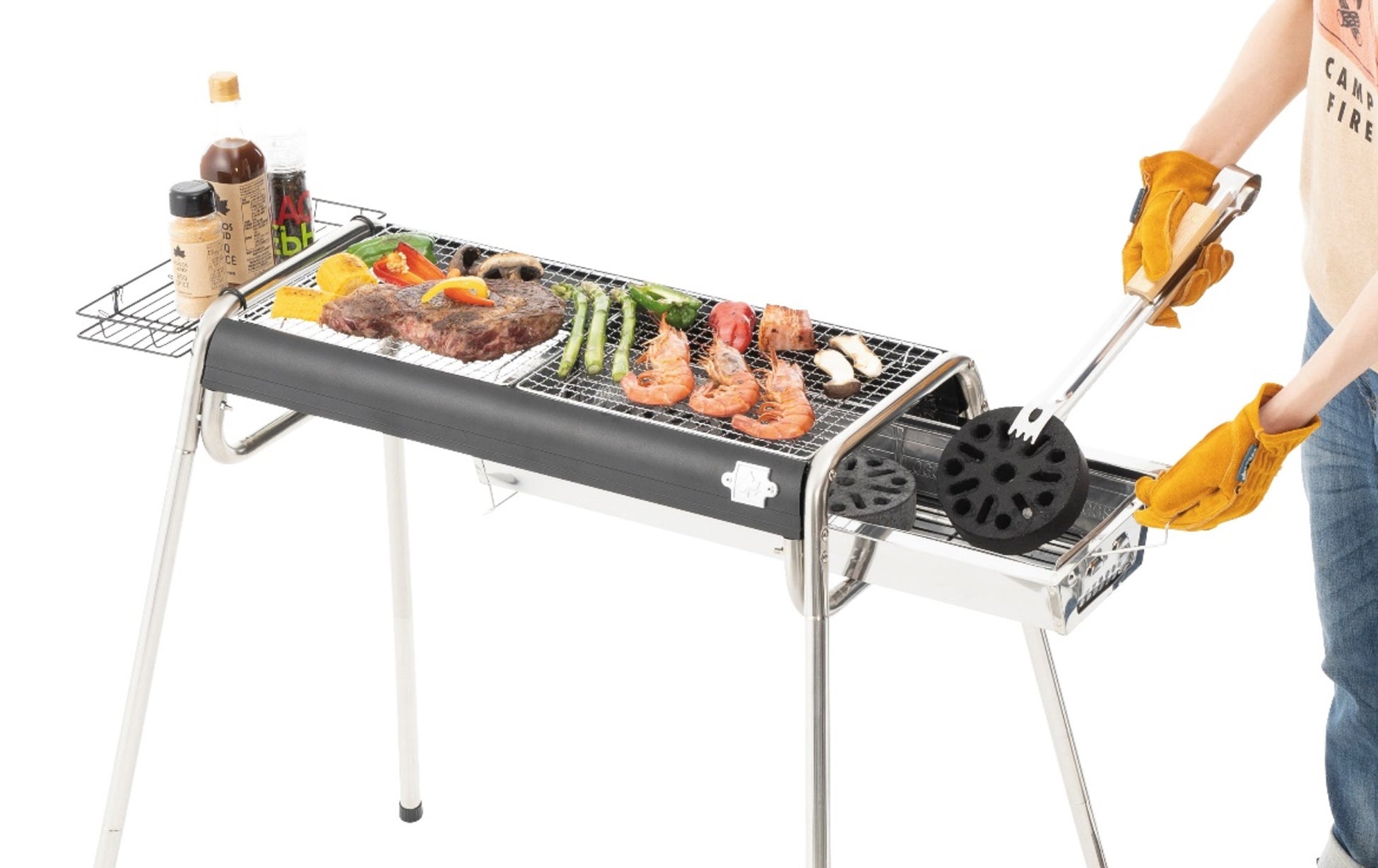 調味料やトングが置けて調理時に活躍する着脱式のサイドラックが付属しており、ラックには3つのフックが付いているので、ゴミ袋などを吊り下げることもできます。さらに、「BBQお掃除楽ちん保護カバー・FD」も付属しており、セットして使用すれば、面倒な残灰の処理が10秒で完了するうえ、火床を守る役割も果たすので、グリルの痛みを軽減させて、長持ちさせることができます。