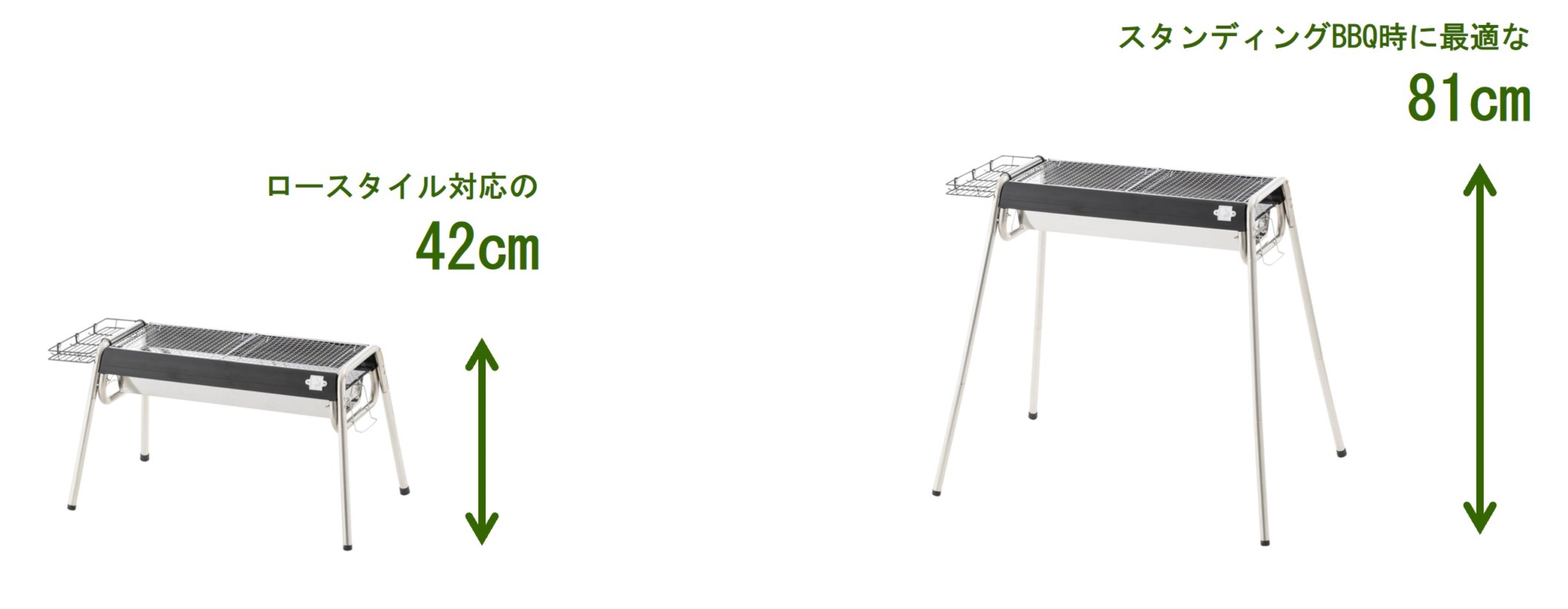 本アイテムは、ブラックとシルバーのツートンカラーで、シンプルかつモダンなデザインのグリルです。多人数でのBBQに適したLサイズで、立食パーティーに最適な81cmのハイポジションと、一般的なアウトドアチェアに座ったまま調理ができる42cmのローポジションとの2段階に高さが調節できます。また、火床が左右に引き出せる構造なので、燃料の継ぎ足しが簡単です。