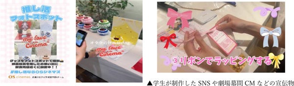 本プログラムでは、OSシネマズが「推し活」施策として展開する館内のフォトブースや推し活向けポップコーンの認知度向上と販売数向上を目指し、参加学生が広告宣伝物の制作から映画館への展開までを担当。中間段階では、アンケートやフィードバック分析を基に、内容をブラッシュアップし第2弾を作成しました。実際に推し活を行う学生の視点を活かし、独自のデザインやSNSを活用した宣伝活動を展開することができました。