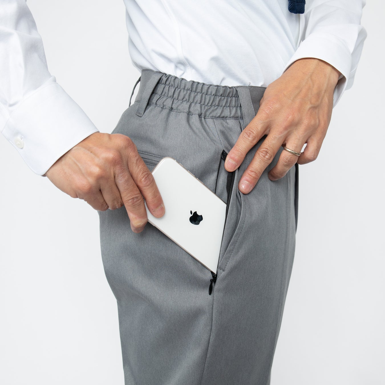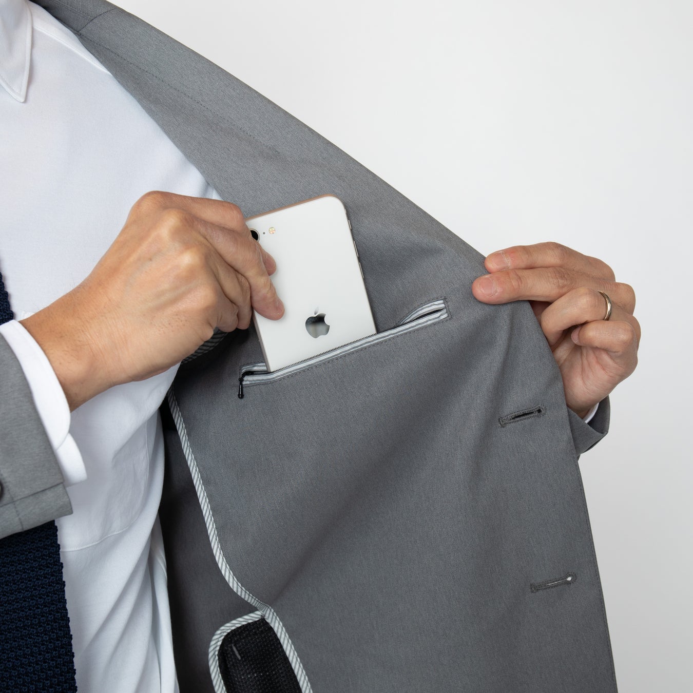 特徴: TPOによって出し入れ可能なフェイクチーフや、ポケットの裏地、腕をまくった際やフロントボタンを開けるとチラリと覗くパイピングにピンストライプ柄を使用。ジャケットの左内ポケットにはファスナーがついており、スマホや名刺入れ、パスポートなどが収納可能。パンツは、サイドをウエストゴムにすることで快適ながらすっきりとした見た目に。目立ちにくいコンシールファスナーを使用したポケットには、落としたくない小物が収納可能。独自開発素材「ultimex」と、特殊な染め方をしたカチオン糸を使用することで、ストレッチ性、速乾、撥水、耐久性、水洗い可、イージーケアの高機能性はそのままに、程よく上品な光沢感と染め分けによる深みのある色合い、ハリのある上質な生地感を実現。