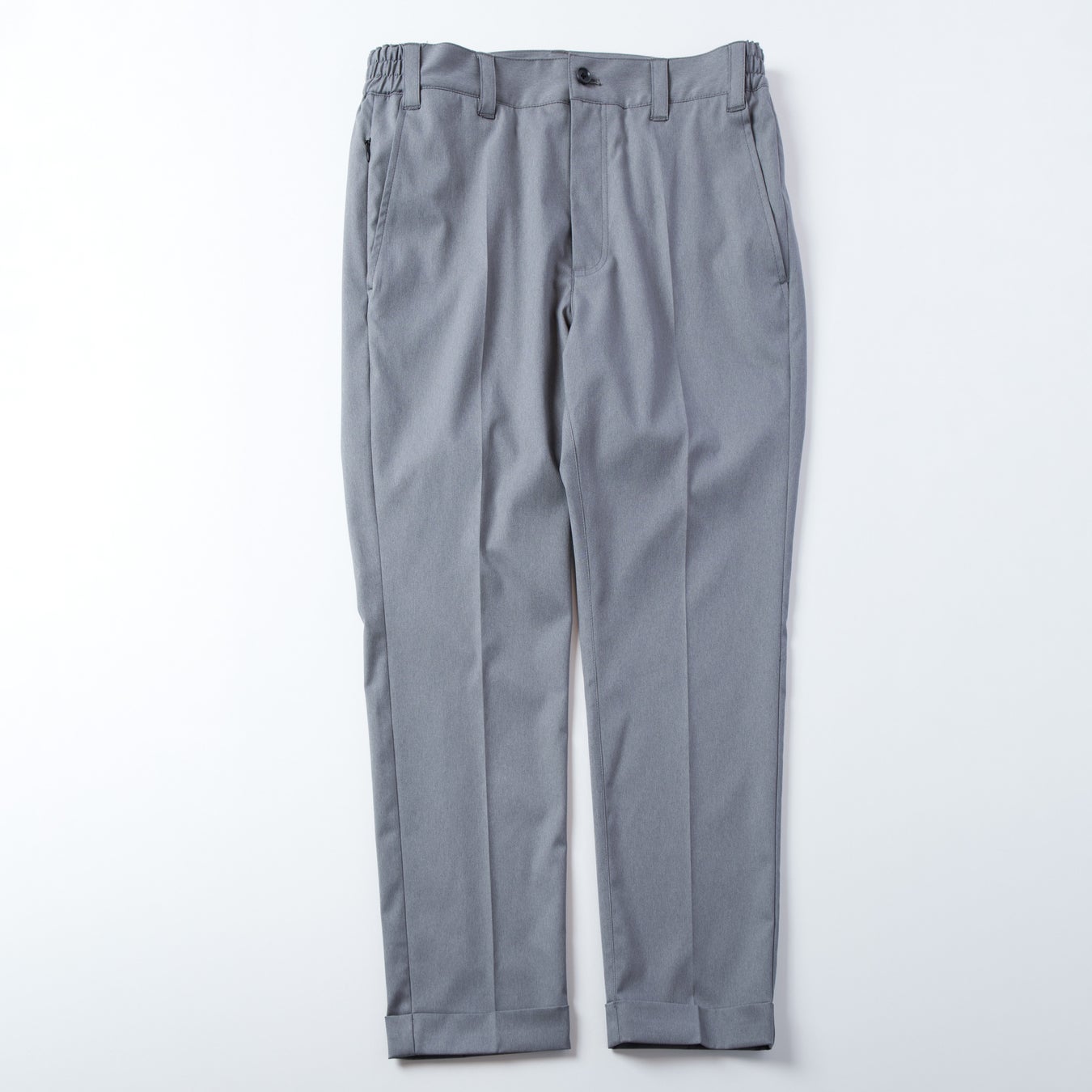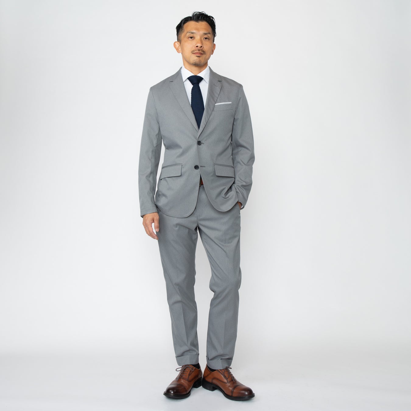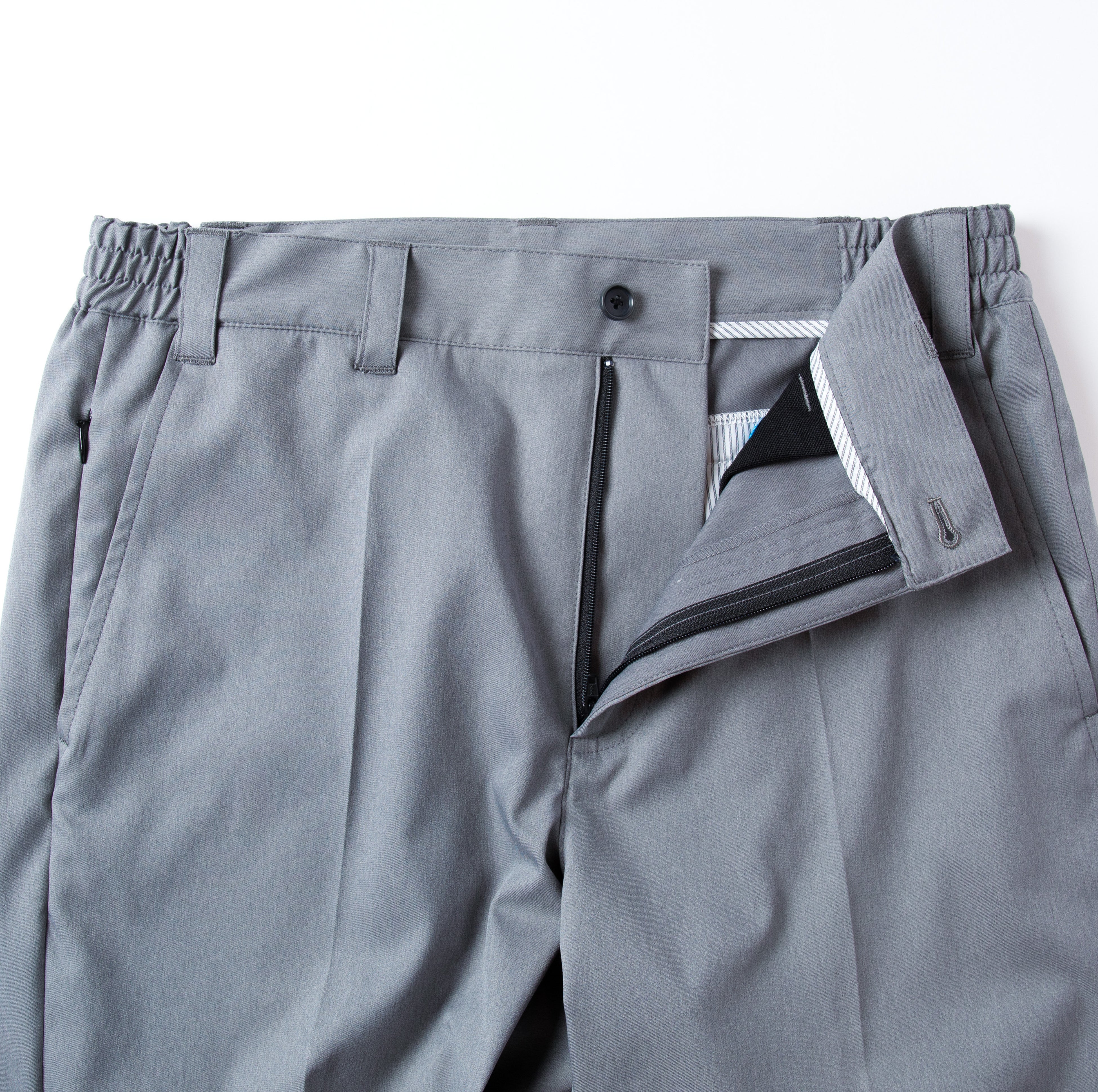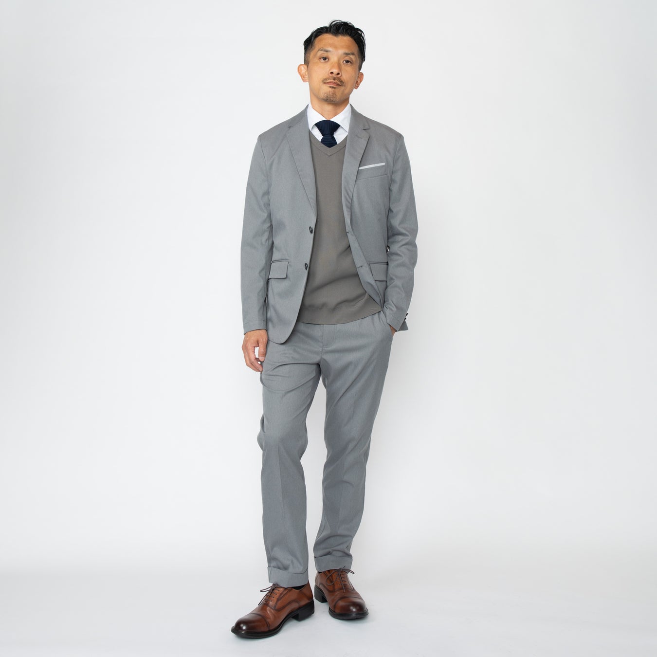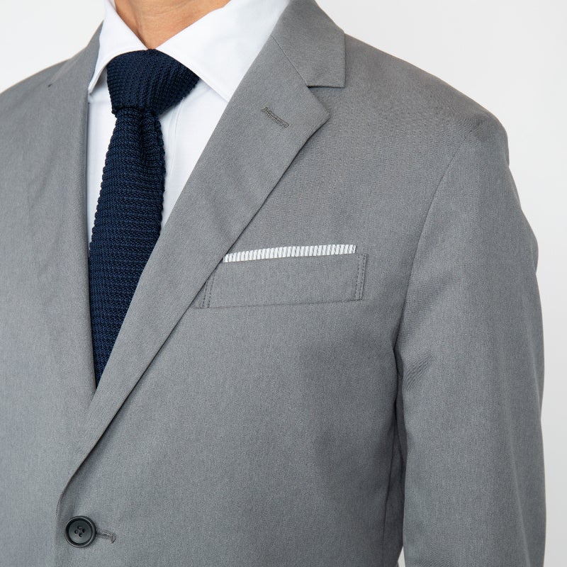 本商品は、独自開発素材「ultimex/アルティメックス」と、特殊な染め方をしたカチオン糸の2種類を使用。「ultimex」が備えるストレッチ性、速乾、撥水、耐久性、水洗い可、イージーケアの高機能性はそのままに、程よく上品な光沢感と染め分けによる深みのある色合い、ハリのある上質な生地感を実現しました。フェイクチーフや、ポケットの裏地、パイピングにピンストライプ柄を使用。パンツ裾はダブルで、革靴にもスニーカーにも合わせやすい丈に仕上げました。