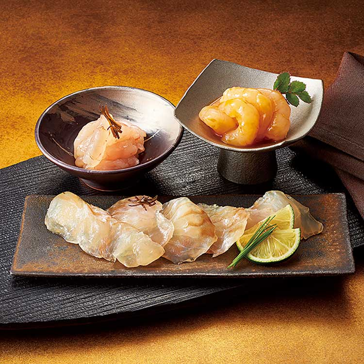 甘えびの甘みを濃厚な雲丹のたれで引き立てた雲丹あわせ甘えびと、北海道産の沖折昆布で旨みを引き出した天然平目と、甘えびの昆布〆を詰め合わせました。ご飯のお供や日本酒のあてにぴったりです。