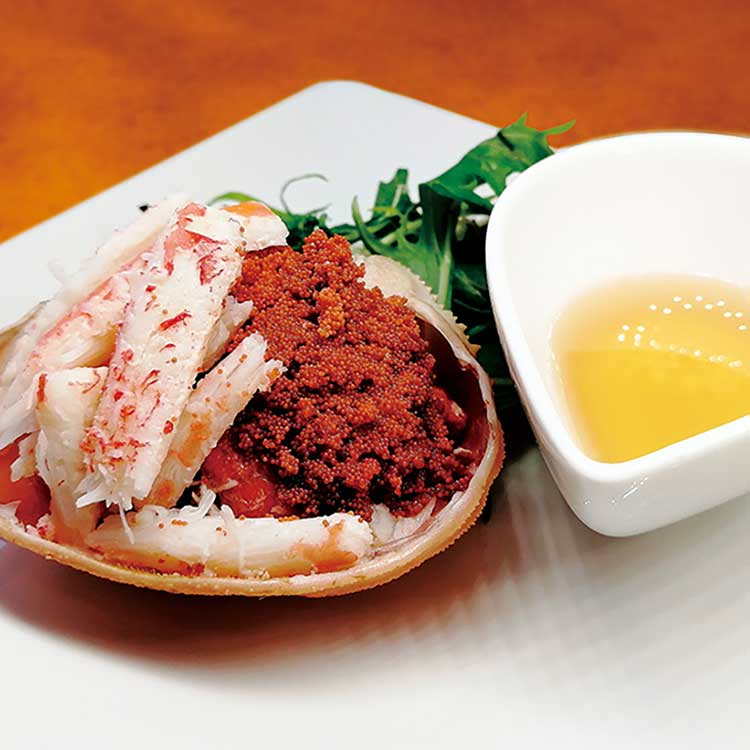 京都府京丹後・間人(たいざ)産のセイコ蟹を使い、一匹分の蟹身と蟹味噌をぎっしり詰め込んだ甲羅盛にしました。濃厚な旨みと贅沢な甘みは、舌の肥えた食通をも魅了します。お好みに合わせて土佐酢を付けても美味しくいただけます。