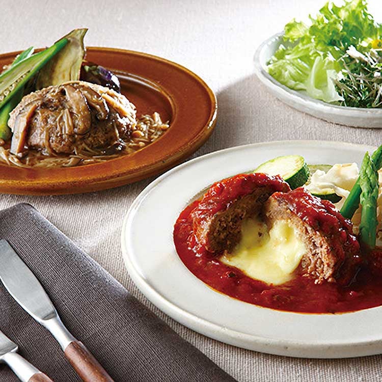 『賛否両論』笠原シェフはきのことなめ茸のバター醤油ソースのハンバーグ、『オステリアルッカ東4丁目』桝谷シェフは、トマトバジルソースのチーズインハンバーグ。和とイタリアン、両シェフが考案した味を楽しめるギフトです。