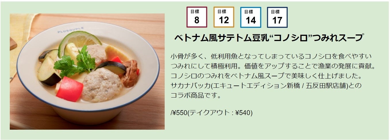 「PLUSOUPLE エキュートエディション御茶ノ水店」では、持続可能な漁業を支えるために、普段は飼料や肥料に使われる低利用魚“コノシロ”を積極的に使用し、魚価向上を目指した「ベトナム風サテトム豆乳“コノシロ”つみれスープ」、スライス加工の過程で発生、処分されるソーセージ、ベーコン、サラミの切れ端部分を使用し、食品廃棄削減に貢献する「常陸野ソーセージ&ベーコンのタルティーヌ」など、サステナブルな限定メニューを多数ご用意しました。おいしく食べて未来へ貢献できるキャンペーンを、ぜひお楽しみください。